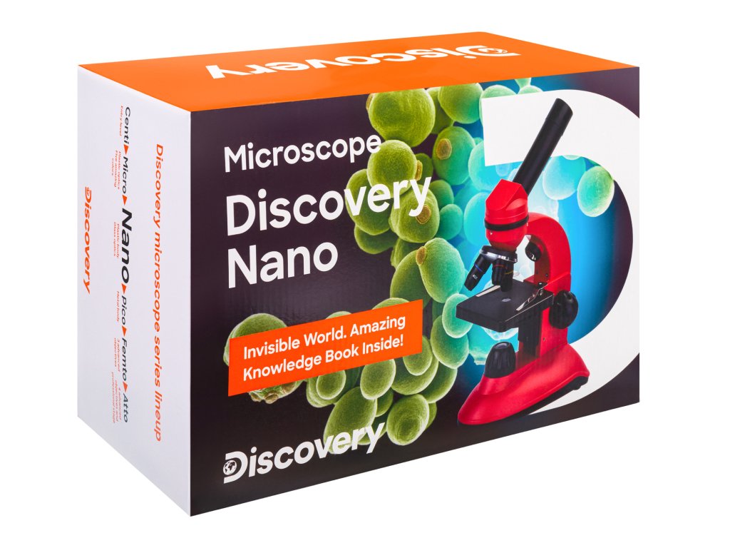 Levenhuk Discovery Nano je klasický monokulární mikroskop základní úrovně pro pozorování vzorků při zvětšení 40—400x. Tímto mikroskopem můžete studovat jak hotové preparáty ze sad, tak i vlastní preparáty. Mikroskop je skvělou volbou pro první seznámení s mikrosvětem a umožňuje vám doma provádět jednoduché vědecké experimenty. Stane se skvělým pomocníkem při studiu biologie ve škole. Sada obsahuje vše, co je nezbytné pro pozorování, včetně příslušenství a také barevnou vzdělávací publikaci "Neviditelný svět".