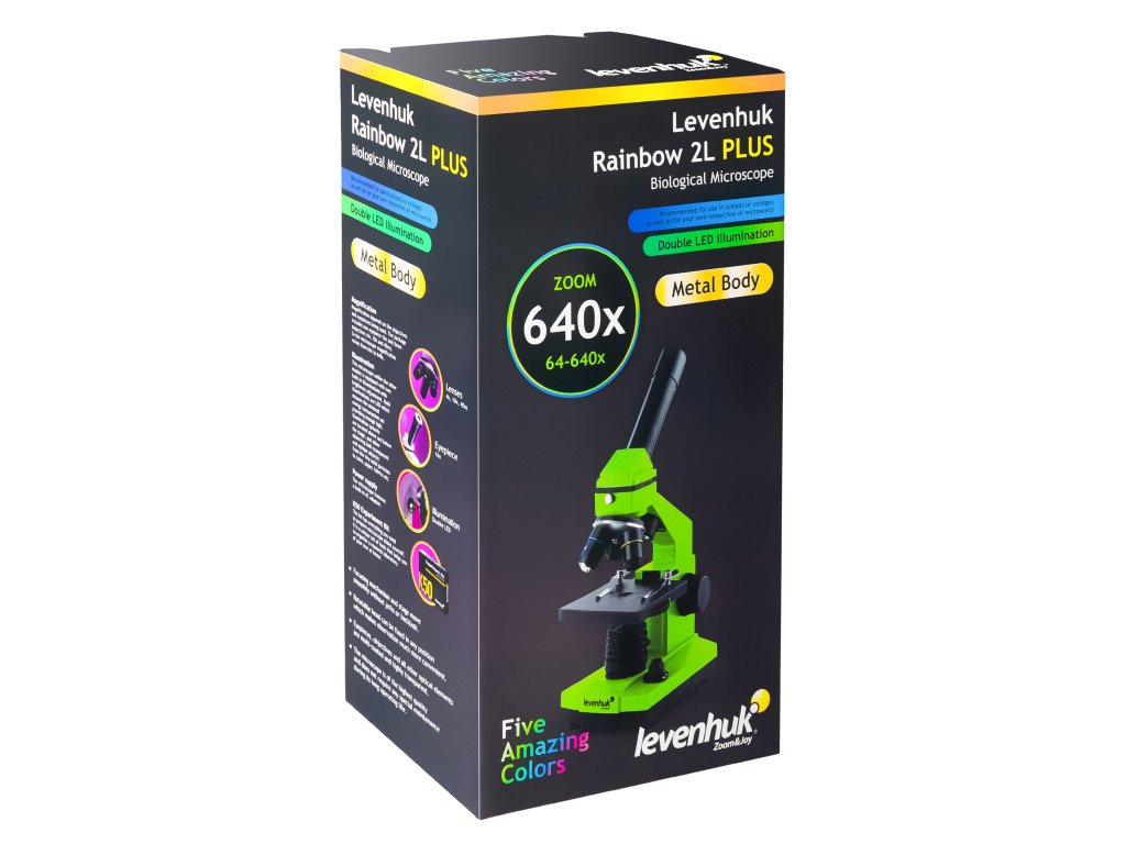 Mikroskop Levenhuk Rainbow 2L PLUS bude vynikající volbou pro žáka, jehož koníčkem je biologie, i pro studenta medicíny při seriozním výzkumu. Tento model má řadu výhod: kvalitní optiku s několikanásobnou antireflexní vrstvou, široký rozsah zvětšení od 64x do 640x, schopnost pozorovat průhledné i neprůhledné objekty a spolehlivé tělo. Začátečníci jistě ocení pokusnou sadu Levenhuk K50, která se dodává společně s mikroskopem. Díky svému krásnému, barevnému designu vyčnívá mikroskop Levenhuk Rainbow 2L PLUS z řady jiných podobných biologických mikroskopů.