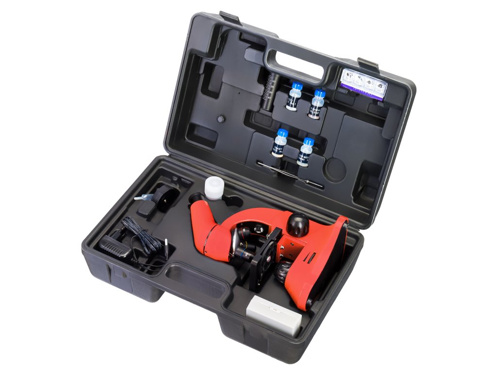 Robustní plastový kufřík zajišťuje bezpečnou přepravu mikroskopu a veškerého