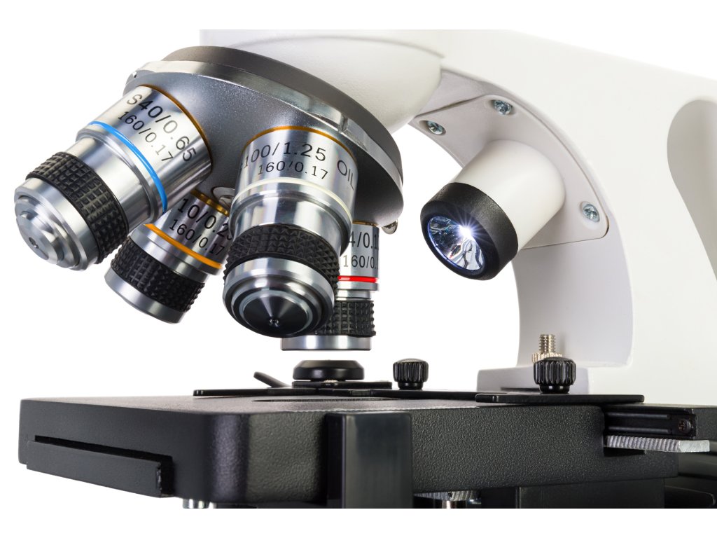 - Achromatické objektivy 4x, 10x, 40x, 100x s odpružením (pro pozorování metodou ponořením preparátu do imerzního oleje)