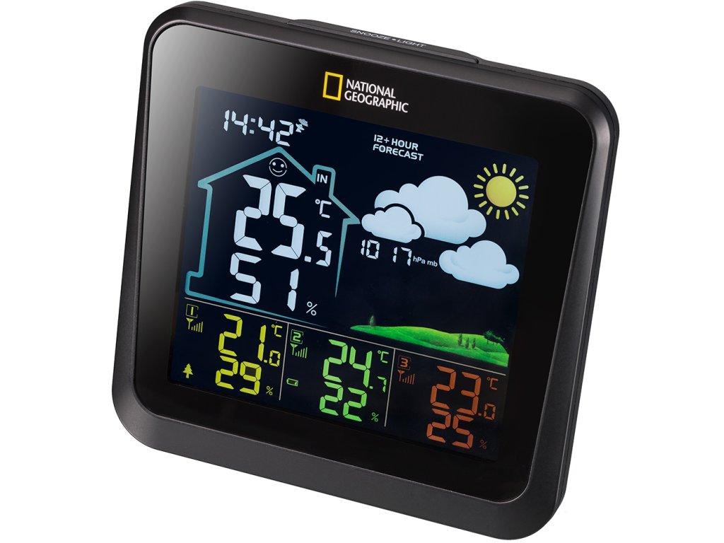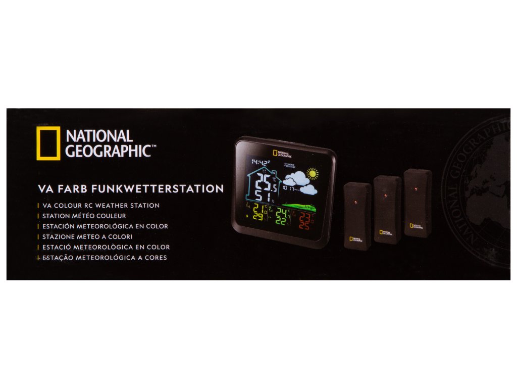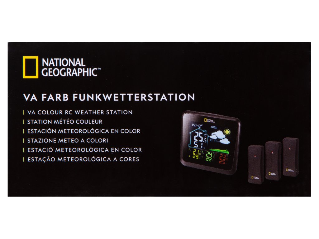 The National Geographic VA colour weather station with 4 measuring points in black displays all relevant weather data at a glance. The set includes 3 outdoor sensors and one built in sensor. On the clearly arranged colour display you will find information such as temperature and humidity for indoor as well as outdoor, as well as the exact time via DCF radio transmission. Besides the built in sensor in the console unit (display) the station is able to receive the temperature and humidity readings from three additional sensors which are included in this set. Its use is therefore very versatile as the sensors can be placed either in- or outdoors. What's the temperature in the kids room, is the basement too moist how cold is it outside? All these questions can be viewed on one display. The station has a time offset function, so although parts of the UK are technically able to receive the European DCF time signal (southern England), your station will be displaying the UK time. For all parts of the UK where the time signal can not be received the time can easily be set manually with this station. The featured weather forecast is for the coming 12-24h.
