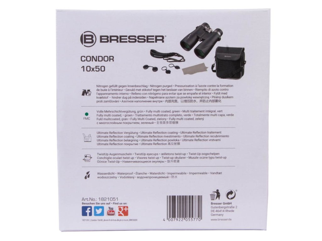 Bresser Condor UR 10x50 provides a clear picture even in difficult lighting conditions for those who want higher magnifications even in difficult lighting conditions. The Condor series offers versatile binoculars – waterproof, nitrogen-filled, handy and high-quality processed. With the rotatable and lockable eyecups, the distance between the eyes can be adjusted for observation with and without glasses; a dioptric correction is standard. All models feature BaK-4 prisms with the special UR coating that brings even more light to your eye. All lenses are fully multi-coated. In addition, the eyepieces and focus wheel are made of sturdy metal.