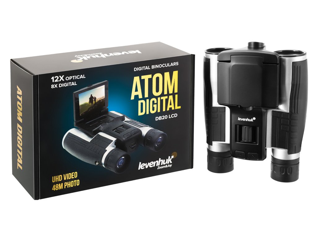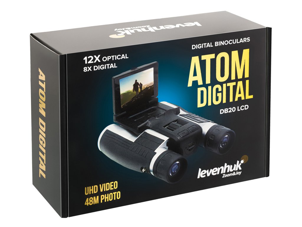 Navzdory kompaktním rozměrům poskytuje optický systém binokulárního dalekohledu Levenhuk Atom Digital DB20 LCD výkonné 12x zvětšení. K dispozici je také digitální zoom v rozsahu 1–8x. Můžete zaostřit na cíle vzdálené až 1000 m: výkon binokulárního dalekohledu je prakticky neomezený. Přístroj má pohodlné tělo založené na schématu „uzavřeného můstku“ a je vybaven výklopným LCD displejem. Obraz na displeji vytváří vysoce citlivý snímač CMOS a jeho ostrost se ovládá centrálním zaostřovacím kolečkem.