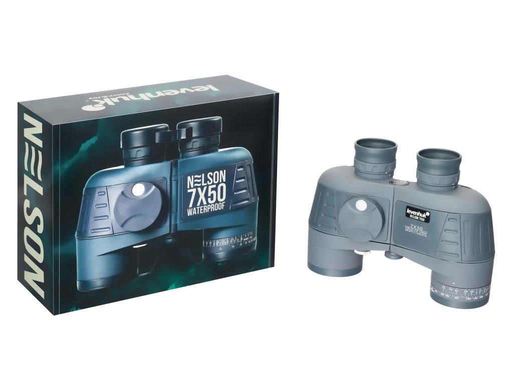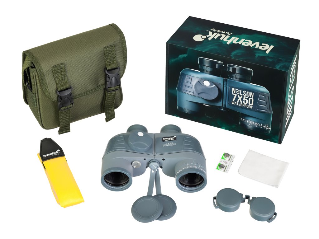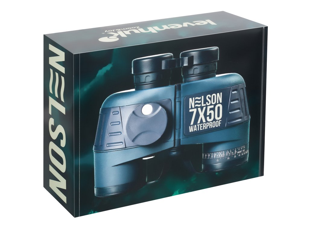 Typickým konstrukčním prvkem tohoto modelu je vestavěný kompas s diodovým osvětlením a dálkoměr. Diodový světelný zdroj je napájen bateriemi. Když se podíváte do okulárů, uvidíte vertikální stupnici dálkoměru a kruhovou růžici kompasu s hodnotou dílku 1°. Sever je 360°, jih je 180°, východ 90° a západ 270°. Námořní triedr Levenhuk Nelson 8x30 se dodává ve vodotěsném plovoucím tělesu: pokud náhodou spadne do vody, nepotopí se, a čočky a hranoly se nepoškodí. Binokulární dalekohled je dodáván s lesklým plovoucím popruhem, který vás ochrání před ztrátou binokulárního dalekohledu ve vodě.