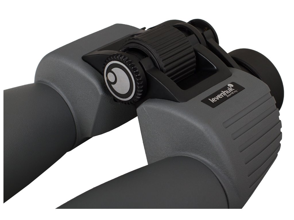 Hermeticky uzavřený plášť přístroj bezpečně chrání před vlhkostí, prachem a nečistotami. Měkké reliéfní pogumování šedé barvy tlumí otřesy a brání poškození choulostivého optického systému. Triedr Levenhuk Sherman PLUS 10x50 se pohodlně drží v ruce.