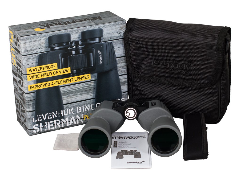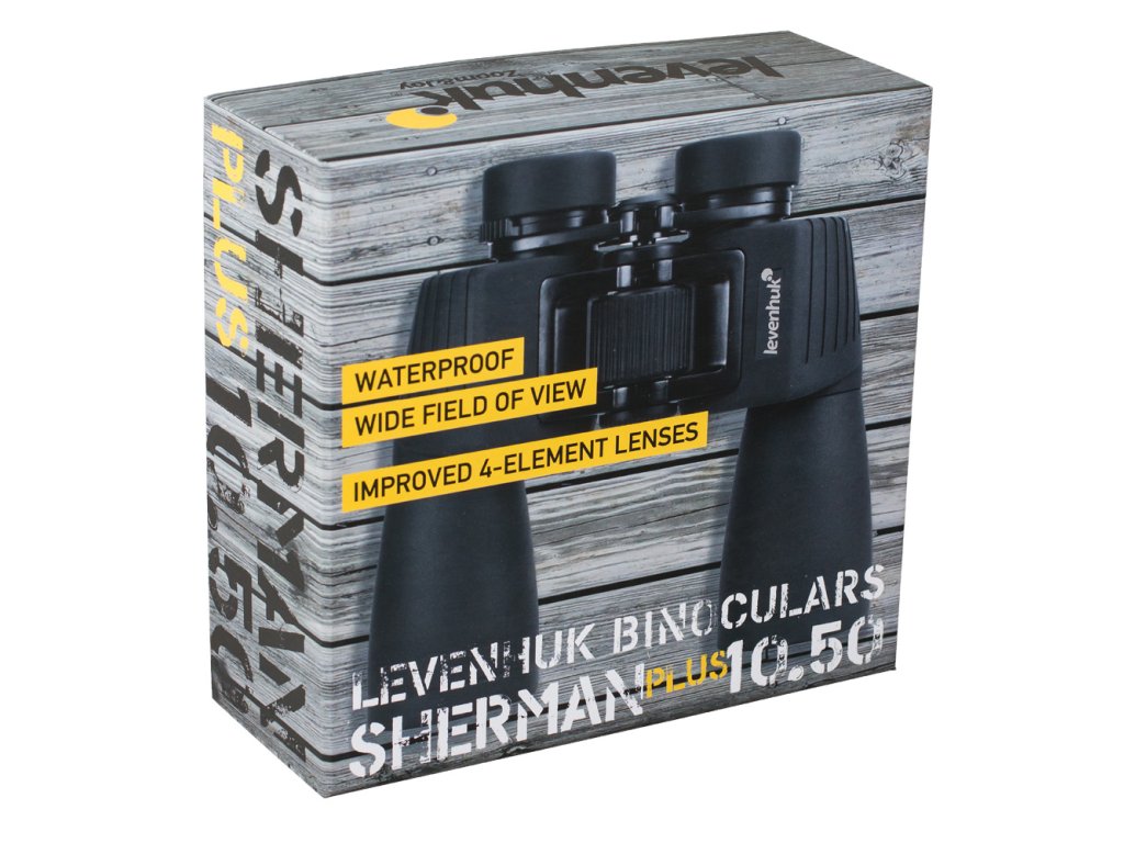 Konstrukce s Porro hranoly umožňuje snížit světelné ztráty uvnitř přístroje. Objektiv je dvouprvkový a okulár se skládá ze čtyř optických prvků. Optika je na všech plochách pokryta několika vrstvami antireflexní povrchové úpravy. K ochraně optiky před zamlžováním i za vysoké vlhkosti je plášť naplněn plynným dusíkem. Binokulární dalekohled Levenhuk Sherman 10x50 vytváří jasný a vysoce kontrastní obraz v živých a přirozených barvách.