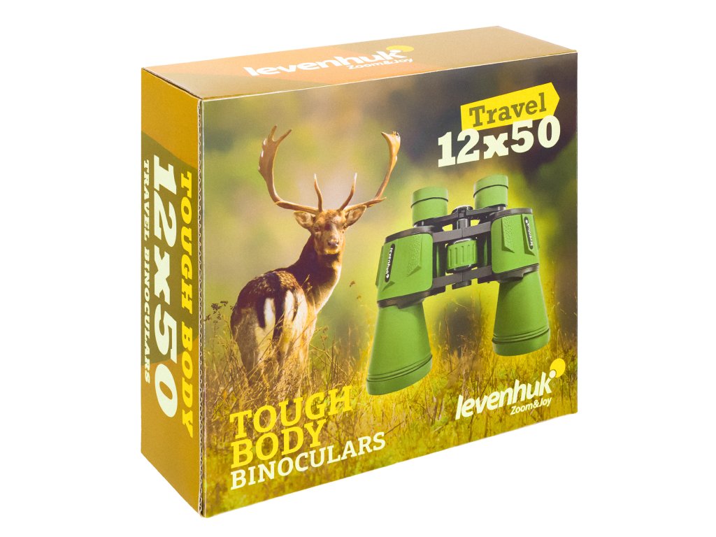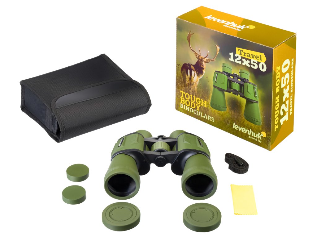 Čočky objektivu s velkou aperturou o průměru 50 mm shromažďují velké množství světla, a proto plně potažená optika založená na Porro hranolech poskytuje jasný, čistý a vysoce kontrastní obraz. Optické prvky jsou vyrobeny ze skla BK-7. Binokulární dalekohled Levenhuk Travel 12x50 poskytuje detailní pohled na vzdálené objekty i za svítání nebo za soumraku. Sestavení binokulárního dalekohledu je snadné. K nastavení ostrosti obrazu se používá centrální zaostřovací kolečko. Očnice lze sklopit nebo rozložit a upravit dioptrie a mezipupilární vzdálenost.