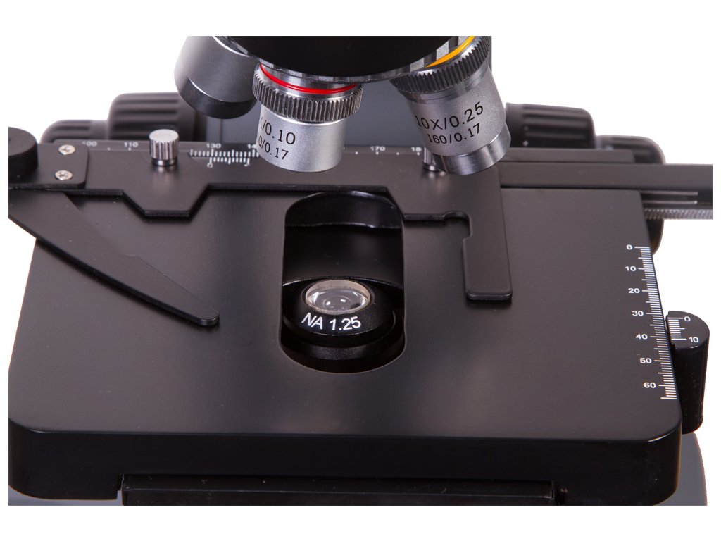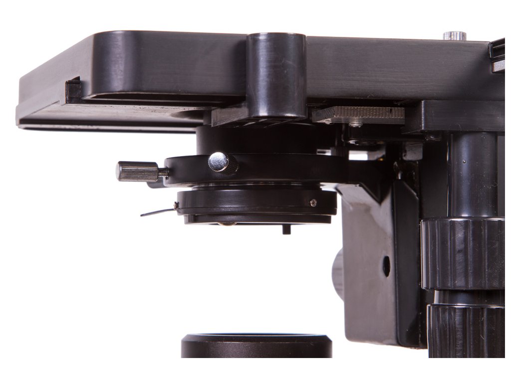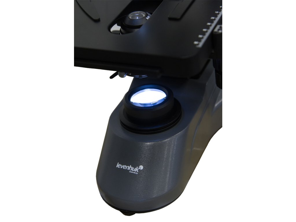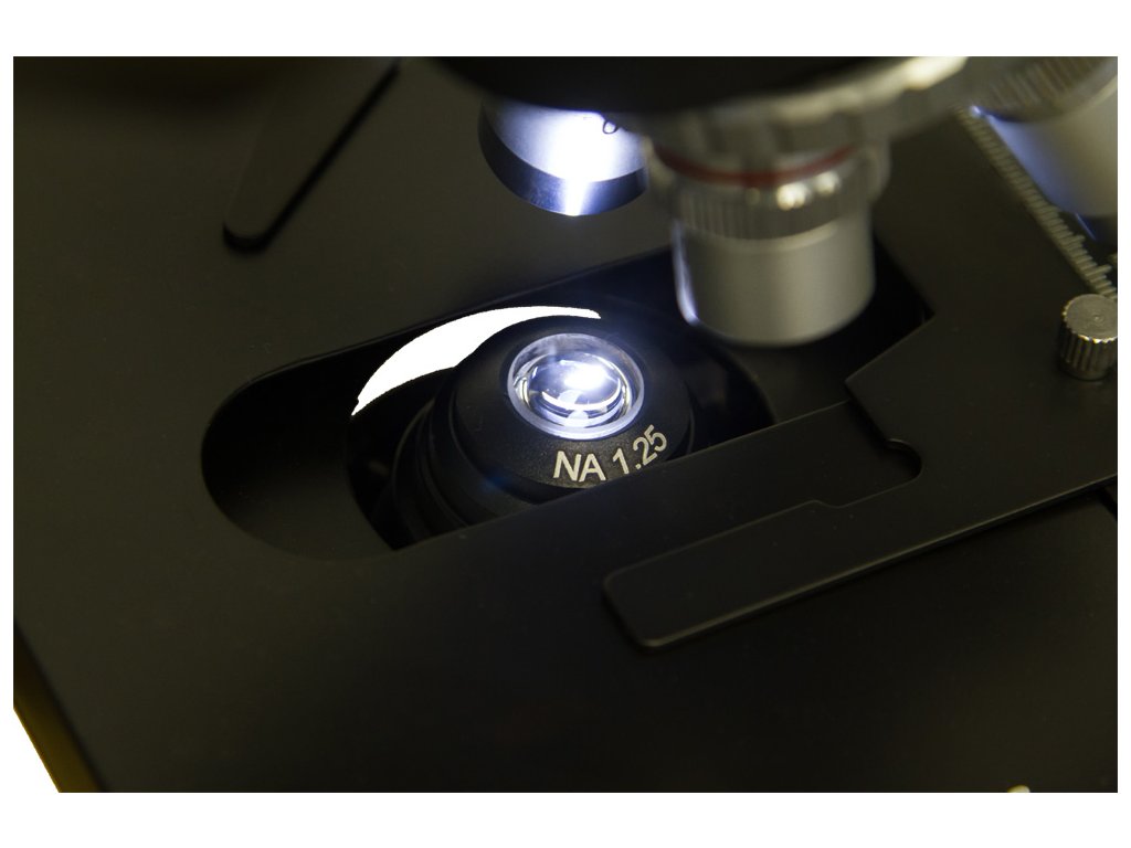 LED osvětlení se nachází pod stolkem a disponuje regulací jasu. Mikroskop je dále vybaven Abbeovým kondenzorem s irisovou clonou, který snižuje světelné ztráty a umožňuje přesně zaostřit světelný paprsek na pozorovaný preparát. Je vybaven speciálními středicími šrouby. Zaostření lze upravit pomocí jediného šroubu – zaostřovací mechanismus umožňuje hrubé a jemné nastavení ostrosti.