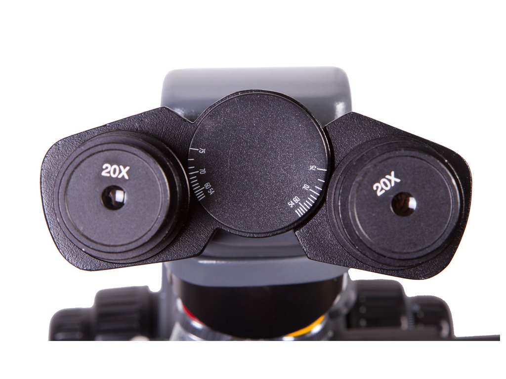 Binokulární mikroskop Levenhuk 720B je kompatibilní s digitálními fotoaparáty Levenhuk (kupují se samostatně). Fotoaparáty Levenhuk se instalují místo okuláru na jeho tubus.