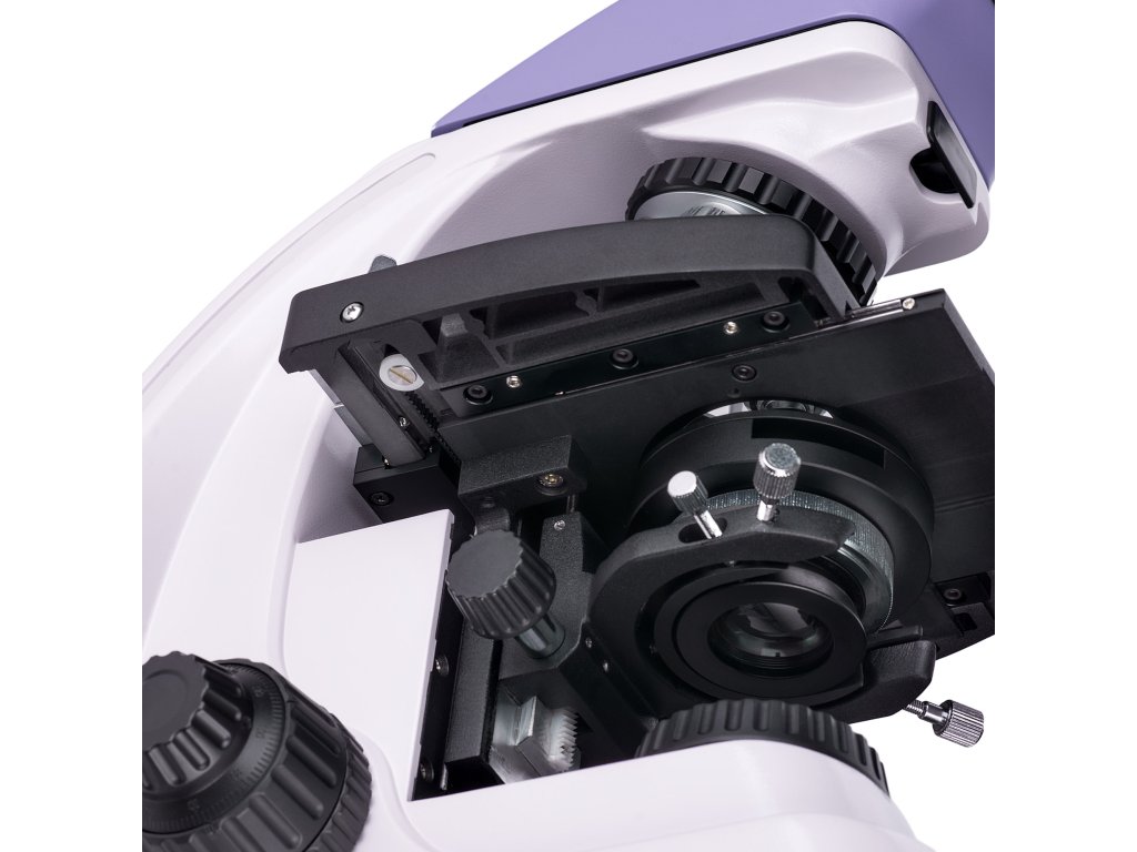 - Koaxiální knoflíky pro hrubé a jemné zaostřování, aretační knoflík a knoflík pro nastavení tuhosti hrubého ostření