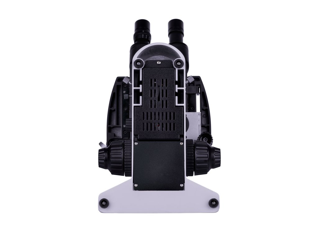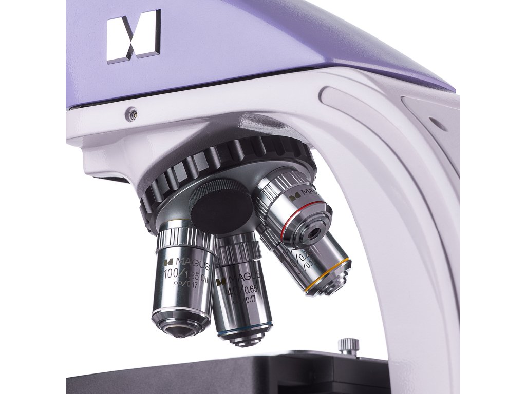 Mikroskop používá achromatické objektivy s korekcí na nekonečno a do revolverového nosiče lze současně namontovat 5 objektivů. Jeden slot je ponechán volný pro přidání dalšího objektivu. Revolverový nosič s objektivy je orientován směrem dovnitř – uživatel vidí objektivy vložené do optické dráhy. Rozsah zvětšení mikroskopu je 40 až 1000x, horní hranici zvětšení lze zvýšit až na 1500, 1600 nebo 2000x pomocí přídavných okulárů.