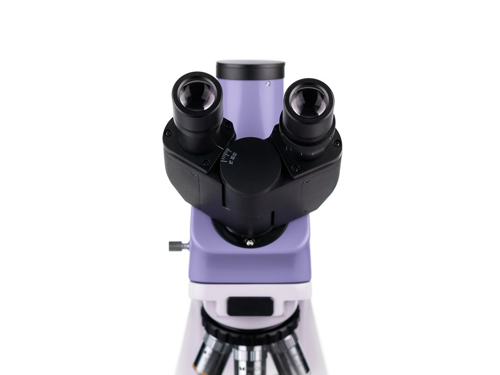 - Trinokulární hlava s vertikálním tubusem pro fotoaparát, otáčení o 360°, nastavení dioptrií na levém tubusu