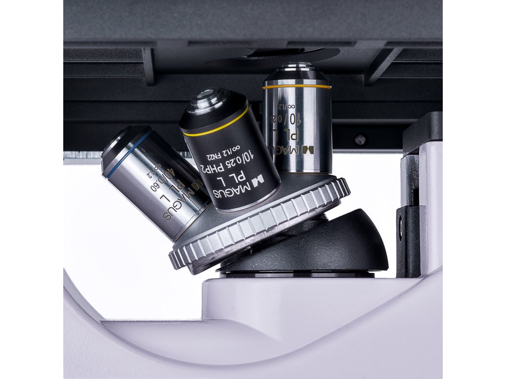 Do otočného nástavce lze namontovat čtyři objektivy, které jsou součástí dodávky, nebo další. Všechny objektivy jsou určeny k použití s laboratorním nádobím a mají dlouhou pracovní vzdálenost. K dispozici jsou 3 plánovací achromatické objektivy pro světlé pole a 1 plánovací achromatický objektiv pro techniku fázového kontrastu.