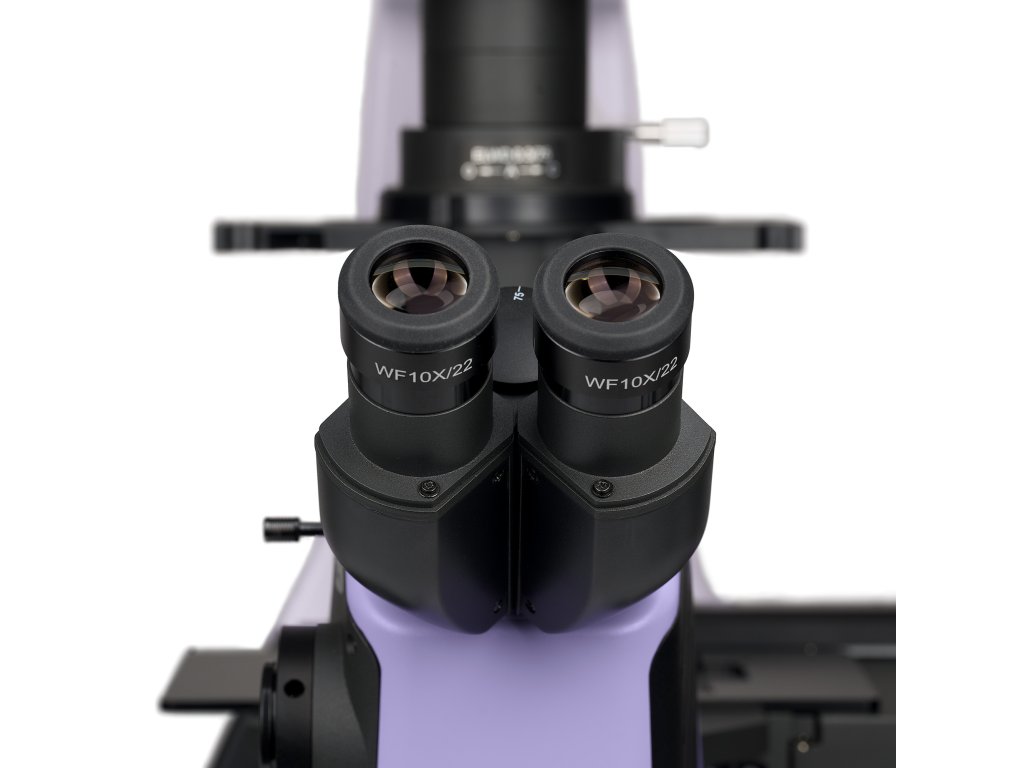 Binokulární hlava s optikou s korekcí na nekonečno. Digitální fotoaparát je nainstalován v bočním portu na hlavě mikroskopu. Paprsek se rozdělí 100/0 nebo 0/100.