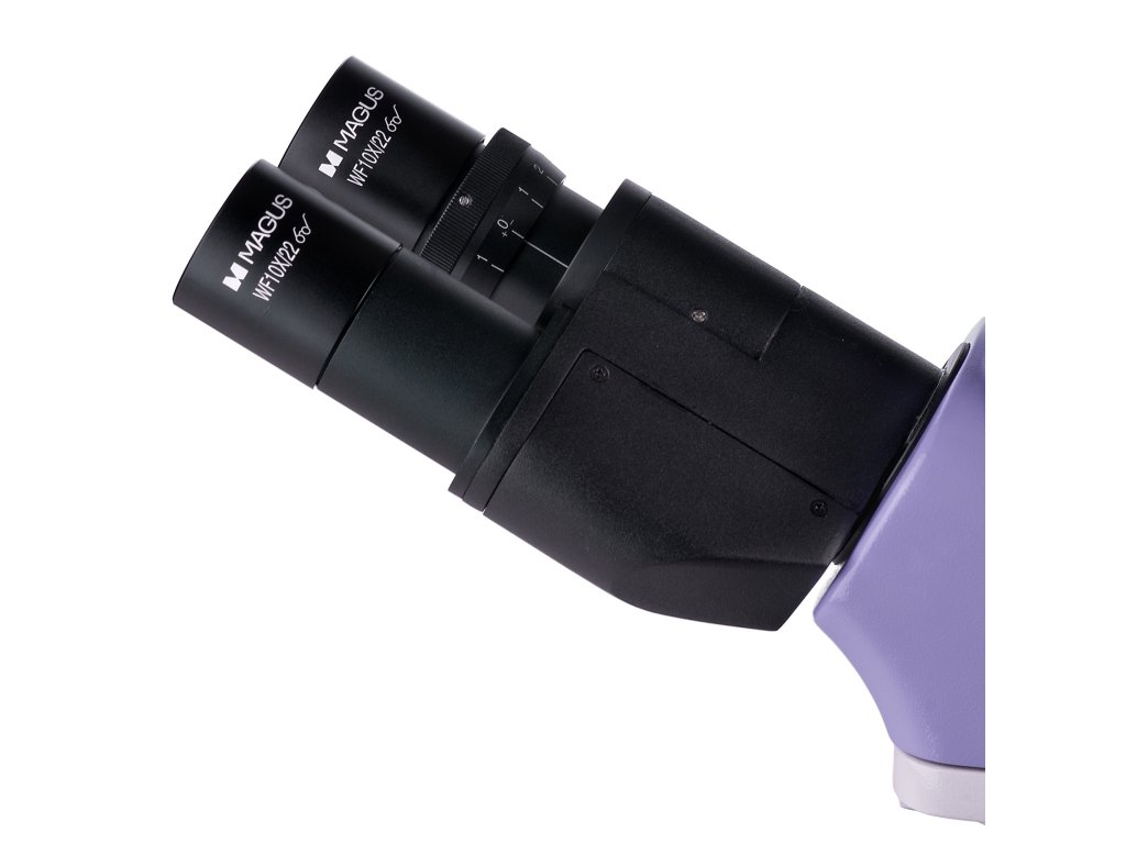 Poloha hlavy mikroskopu je pohodlná pro dlouhou práci. Výšku okulárů lze nastavit otáčením tubusů okulárů o 360°. Levý tubus je vybaven kroužkem pro nastavení dioptrií a lze do něj také upevnit digitální fotoaparát (fotoaparát není součástí dodávky).
