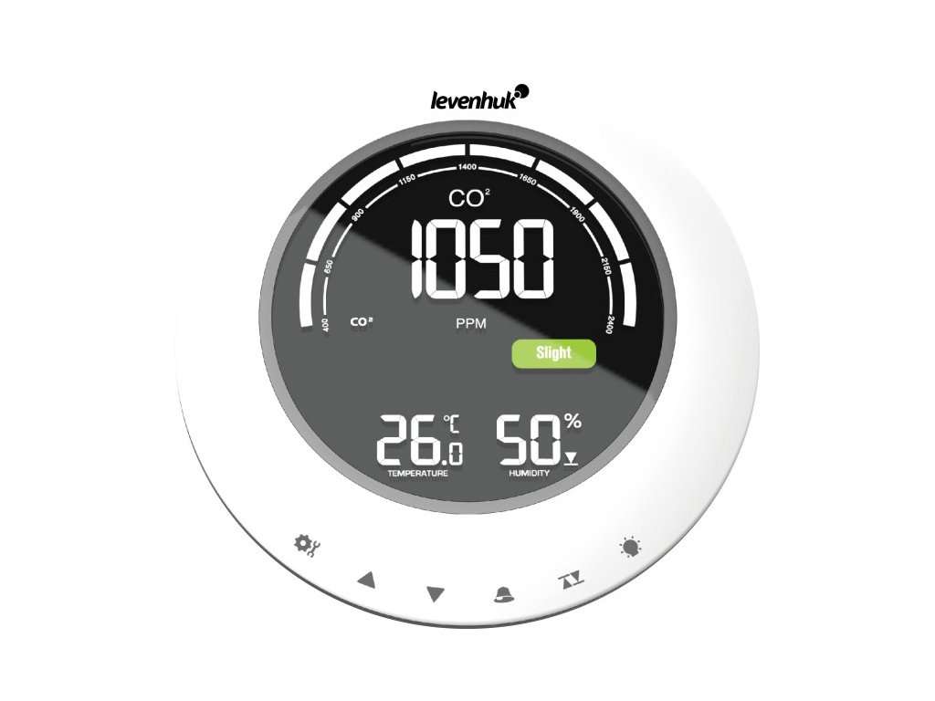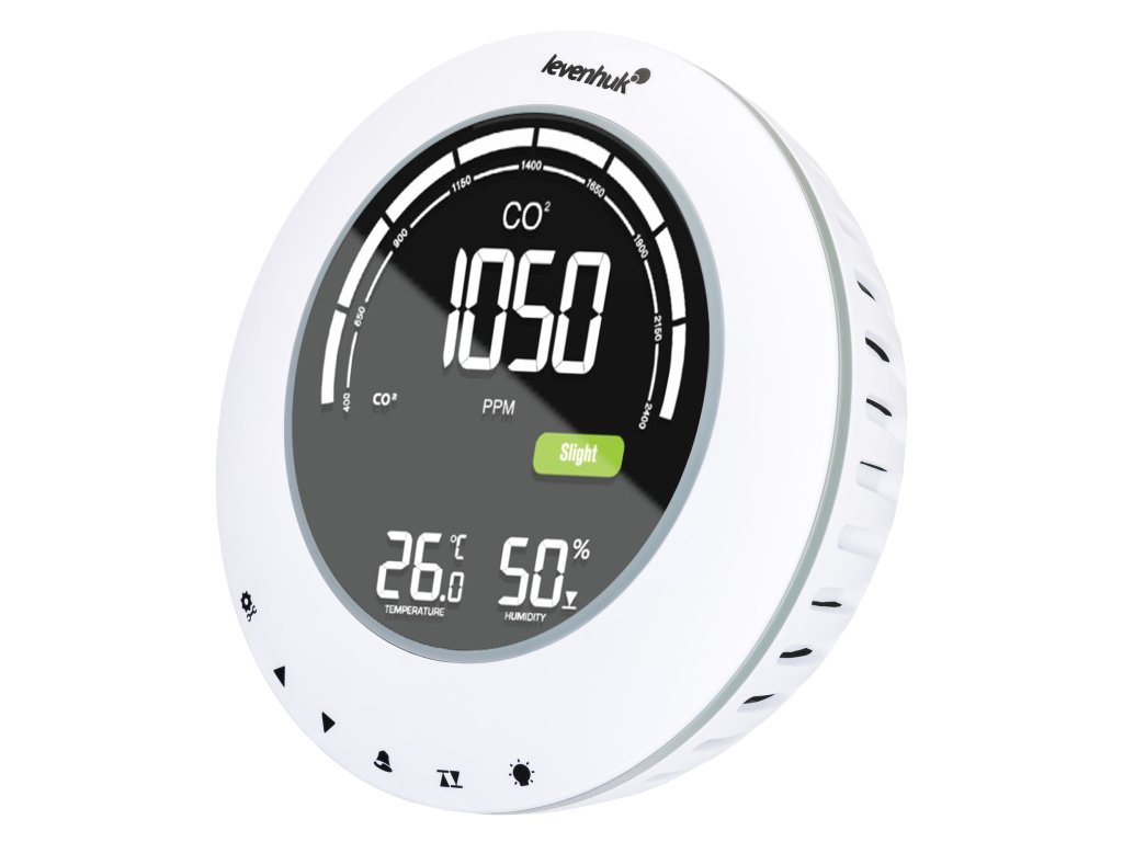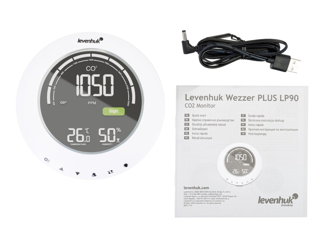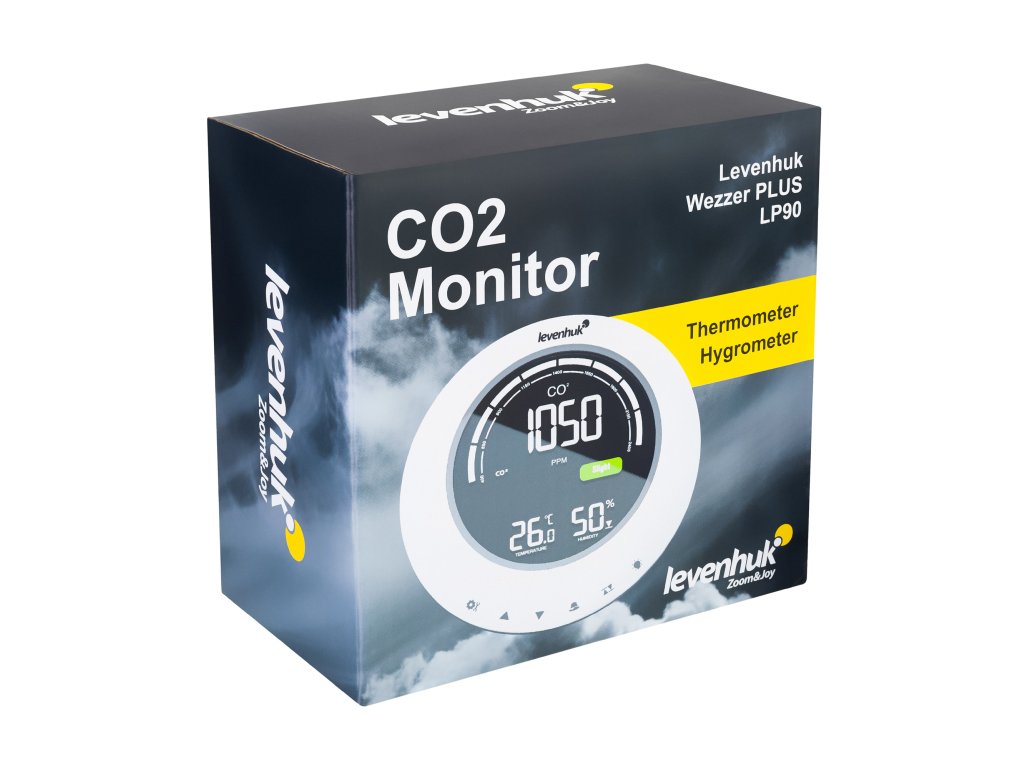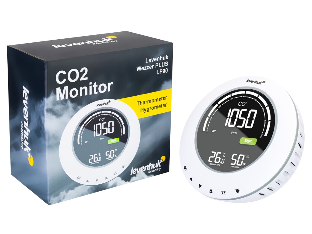 Levenhuk Wezzer PLUS LP90 je kompaktní detektor hladiny koncentrace CO₂, který dokáže měřit také teplotu a vlhkost vzduchu. Tento malý přístroj vás upozorní, pokud jsou hladiny koncentrace CO₂ nebo úroveň vlhkosti považovány za příliš nízké nebo příliš vysoké, což z vnitřního prostoru činí méně příjemné místo k pobytu. Pokud koncentrace oxidu uhličitého přesáhne doporučenou hladinu pro větrané místnosti, přístroj vás upozorní, abyste místnost vyvětrali. Na barevné LCD obrazovce jsou k dispozici digitální a zvuková upozornění. Pokud chcete, můžete zvukový signál vypnout.