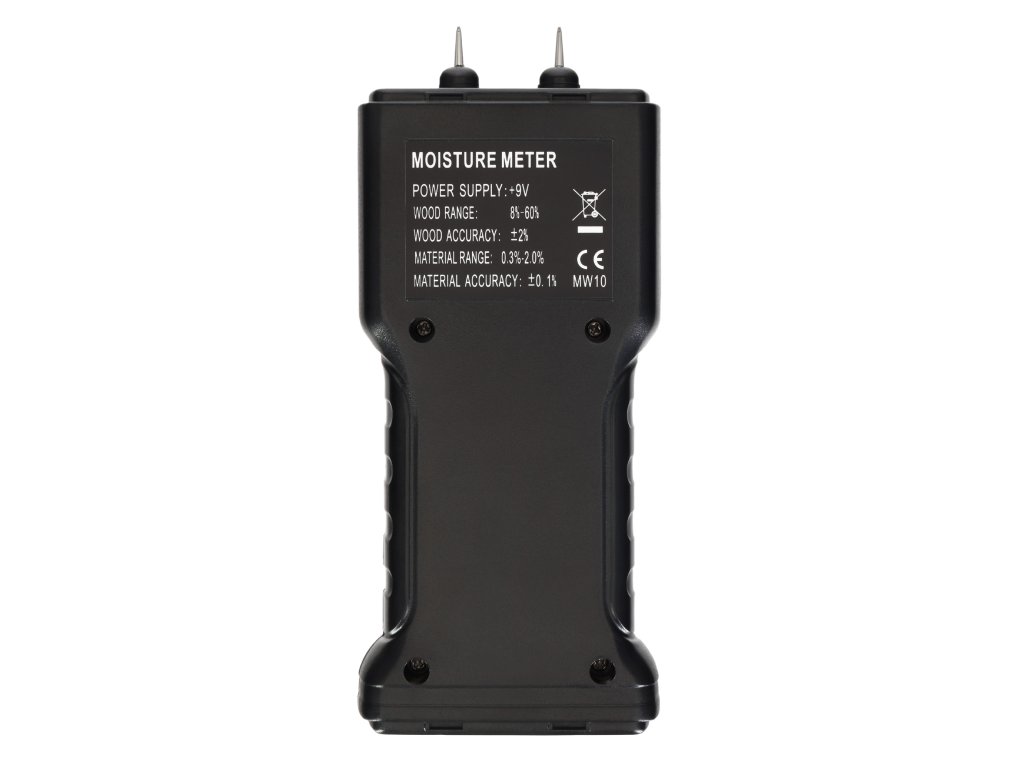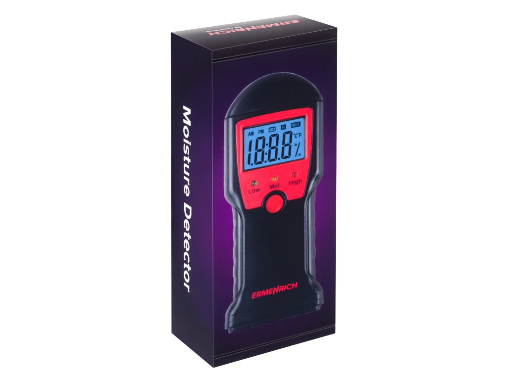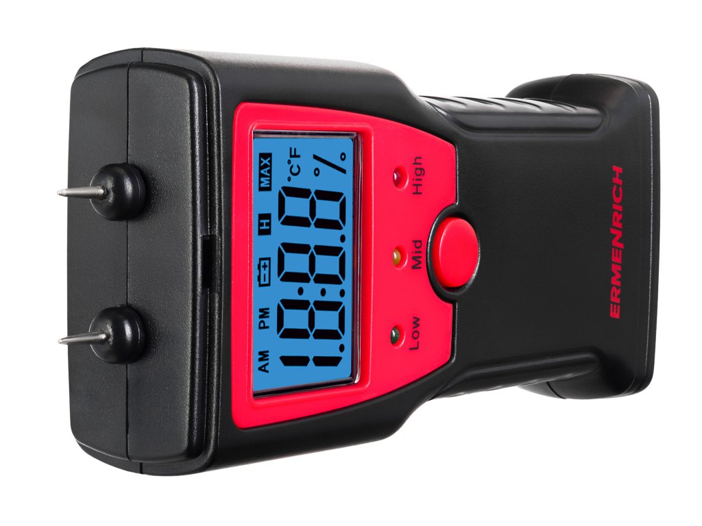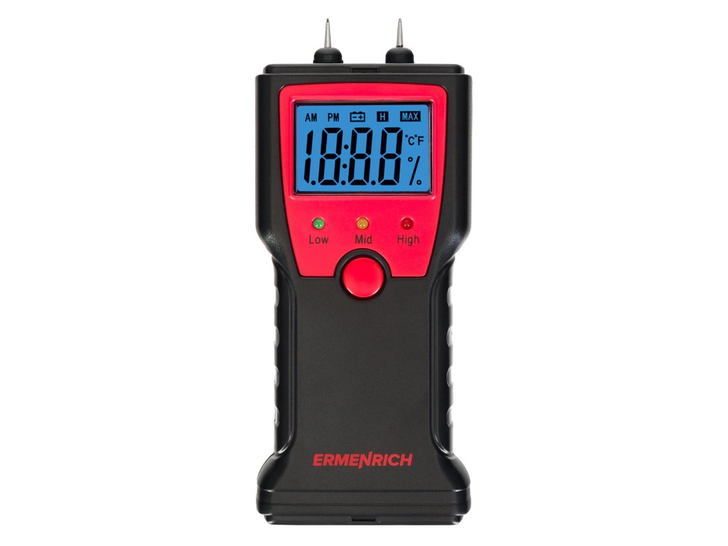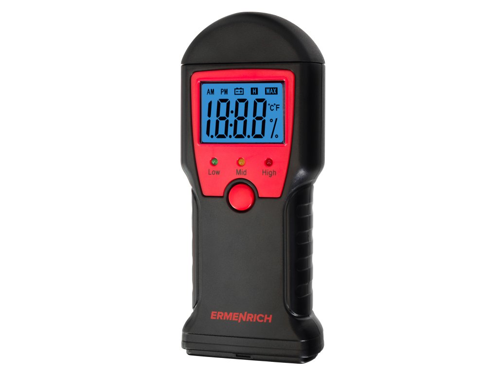 Ermenrich Wett MW10 je kolíkový detektor vlhkosti pro stanovení vlhkosti dřeva, stavebních směsí a malty. Přístroj může měřit také teplotu ve stupních Celsia nebo Fahrenheita. Jednoduché ovládání pomocí jediného tlačítka. Naměřené hodnoty se zobrazují na vestavěném displeji s velkými číslicemi a jasným modrým podsvícením. Pod displejem jsou tři LED indikátory, které udávají celkové hodnocení úrovně obsahu vlhkosti v materiálu: zelená znamená nízkou, žlutá zvýšenou a červená vysokou úroveň.