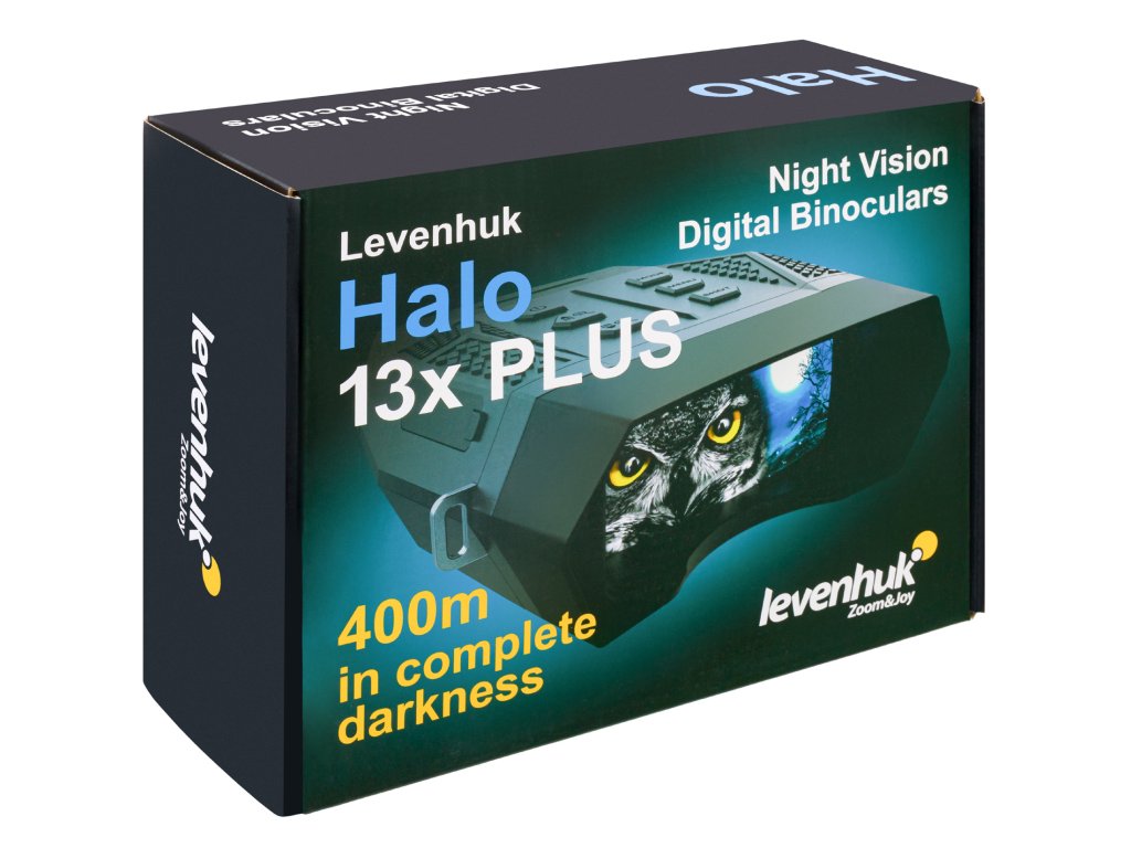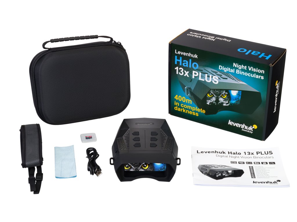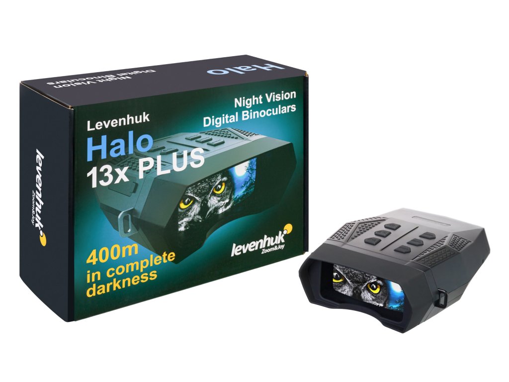 Binokulární dalekohled s nočním viděním Levenhuk Halo 13X PLUS – skvělý přístroj pro pozorování v různých prostředích. Binokulární dalekohled není ovlivněn denním světlem a lze jej používat nejen jako zařízení pro noční vidění, ale i jako běžný binokulární dalekohled. Binokulární dalekohled je voděodolný, je vybaven rekordérem a IR přísvitem, a lze jej upevnit na stativ. Tento binokulární dalekohled bude skvělým nástrojem pro noční lov a turistiku a hodí se také pro ochranu území a průzkum.