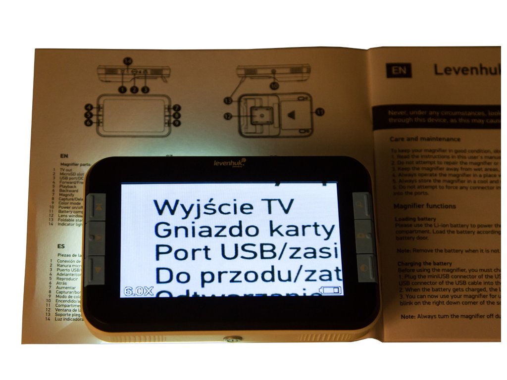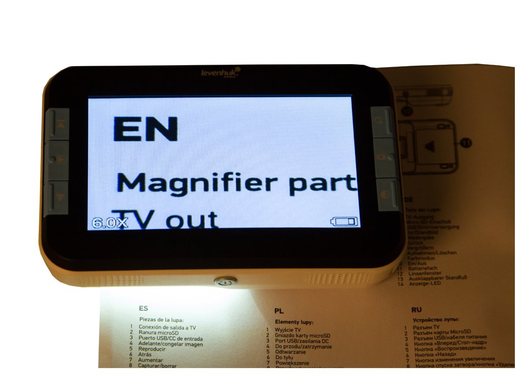 Tato lupa má uživatelsky přívětivý design. Stačí ji umístit přímo nad text a při čtení jí pohybovat po stránce. Zvětšený obraz se objeví přímo na zabudované LCD obrazovce. Pokud je lupa v době fotografování připojena k počítači, můžete snímky ukládat na pevný disk. Lupu lze kdykoli připojit k televizoru nebo počítači a obrázky a texty si prostudovat podrobněji. V reálném čase můžete měnit barevné režimy i zvětšení a vybrat si pro vás nejvhodnější nastavení. Během práce s textem můžete pořizovat snímky obrazovky a ukládat je na paměťovou kartu nebo na pevný disk.