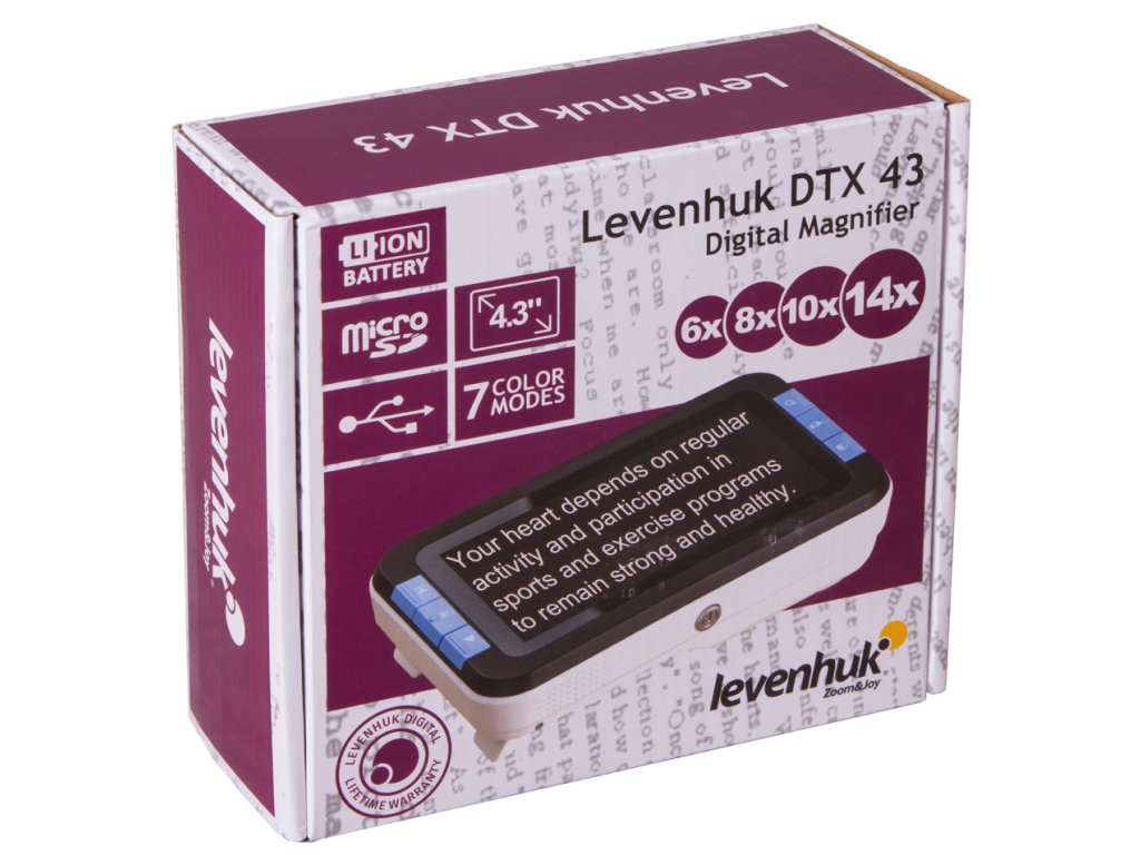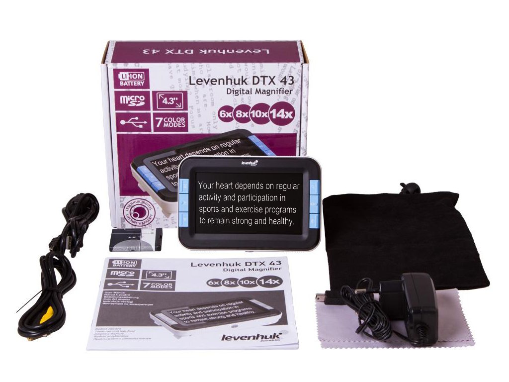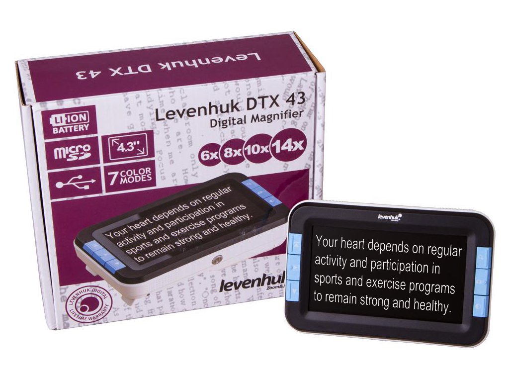 Digitální lupa Levenhuk DTX 43 je napájena z baterií nebo ze sítě. Provozní doba bez dobíjení je 120 minut. Lupa má zabudované LED osvětlení, které umožňuje čtení i v úplné tmě. Pomocí speciálního teleskopického stojanu můžete lupu zvednout nad desku stolu a použít ji k psaní. S lupou Levenhuk DTX 43 můžete psát dopisy, luštit křížovky i kreslit.