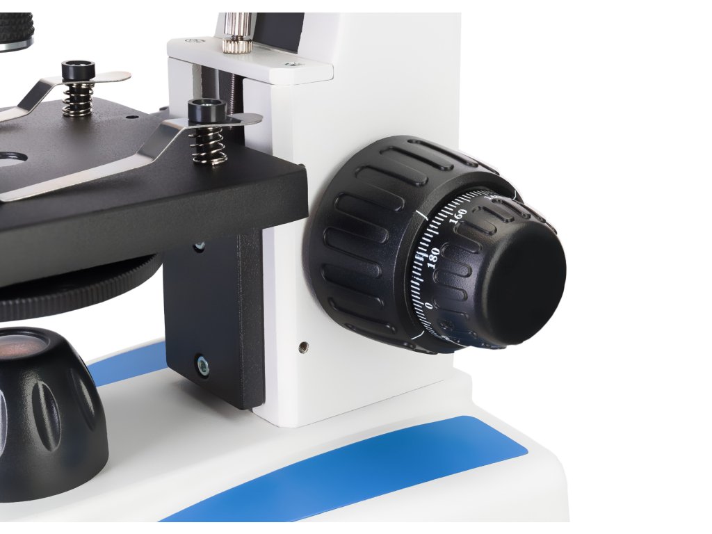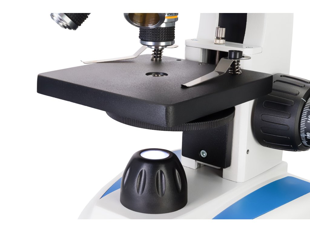 Vzorky jsou na stolku upevněny pomocí držáků vzorků a kotoučové aperturní clony. Osvětlení je duální: LED diody jsou umístěny na obou stranách stolku. K dispozici je funkce nastavení jasu. Osvětlení lze napájet ze sítě nebo z baterií.