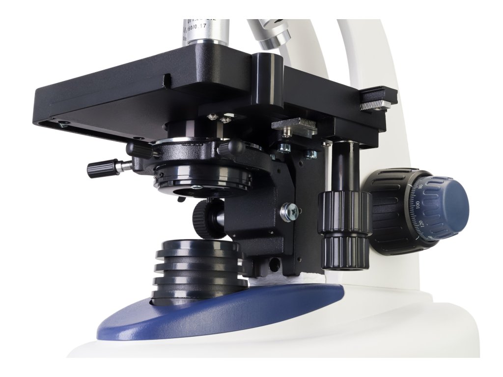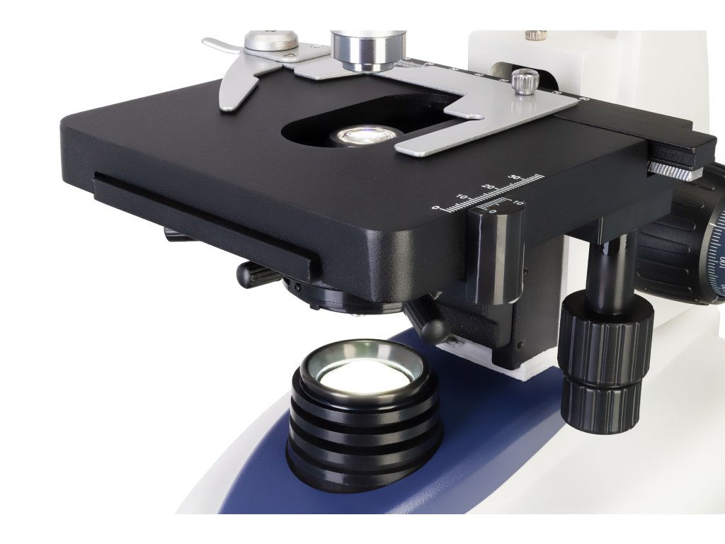 Stolek je vybaven mechanickým měřítkem; pod tímto stolkem se nachází Abbeův kondenzor s irisovou clonou a držákem filtru. Spodní osvětlení mikroskopu zajišťuje stmívatelná LED dioda, která vyžaduje síťové napájení.