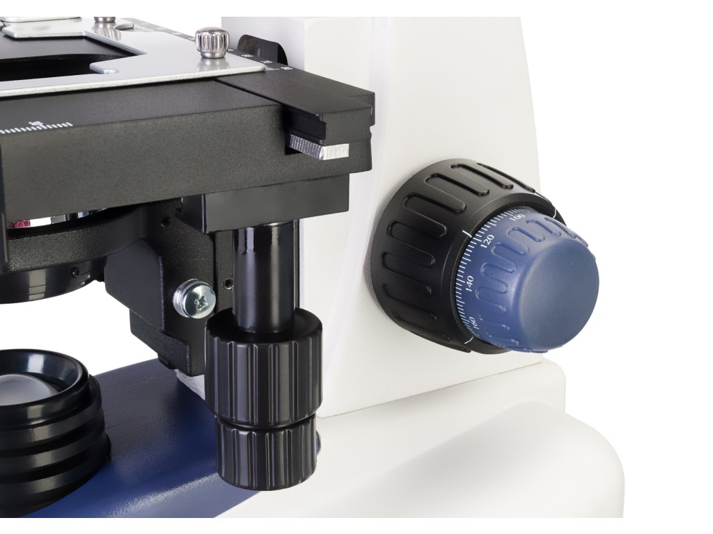 Achromatické čočky objektivů poskytují jasný a ostrý obraz v celém zorném poli. 100x objektiv pro pozorování metodou ponořením preparátu do imerzního oleje. Obraz v reálném čase se zobrazuje na LCD obrazovce. K pozorování můžete použít dva typy zvětšení: optické zvětšení se pohybuje od 40x do 1000x a digitální může dosáhnout až 2000x. Zaostřování je rovněž k dispozici ve dvou režimech: hrubém a jemném.