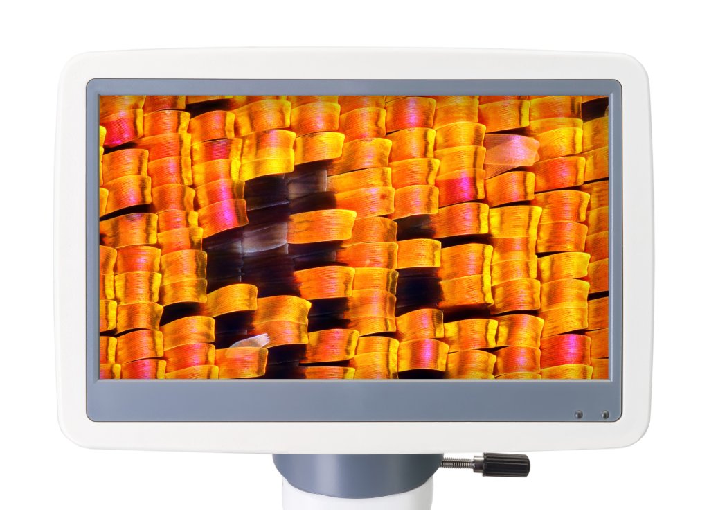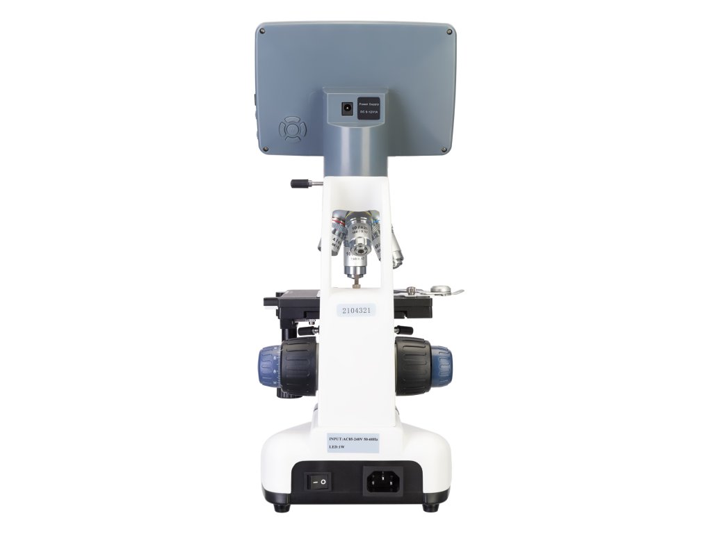 Ovládací tlačítka pro manipulaci s digitálními funkcemi jsou umístěna na bočním panelu a na zadní straně obrazovky. Tělo mikroskopu je kovové, optika je vyrobena ze skla.