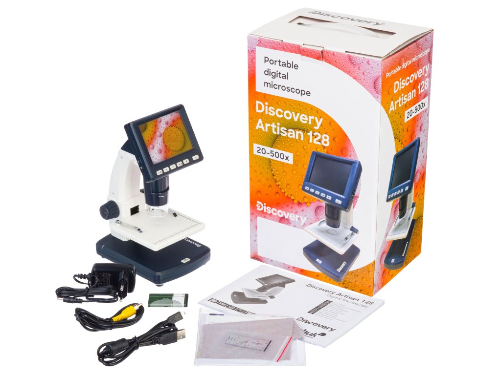 Digitální mikroskop Levenhuk Discovery Artisan 128 má zabudovaný 3,5" LCD obrazovku, na kterou se přenáší obraz z objektivu. Obraz může být také zobrazen na externí obrazovce, nejen na monitoru PC, ale také na obrazovce televizoru. Mikroskop je kompatibilní se zařízeními s operačním systémem Windows a Mac OS a mikroskop lze k nim připojit pomocí kabelu USB. K připojení zařízení k televizoru se používá kabel AV. Mikroskop také umožňuje fotografování, nahrávání videa a měření (lineární, úhlové, poloměry, průměry atd.).