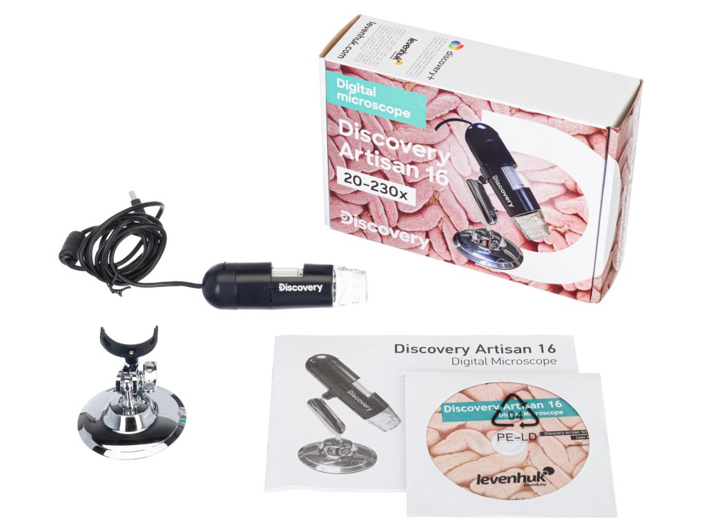 Mikroskop je kompatibilní s operačními systémy Windows a Mac OS. K připojení k PC a k nabíjení mikroskopu se používá kabel USB. Tělo mikroskopu je pogumováno pro pohodlné uchopení. Digitální mikroskop Levenhuk Discovery Artisan 16 je velmi uživatelsky přívětivý. Je malý. Proto na vašem stole nepotřebuje mnoho místa.
