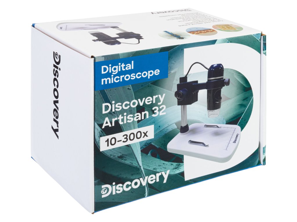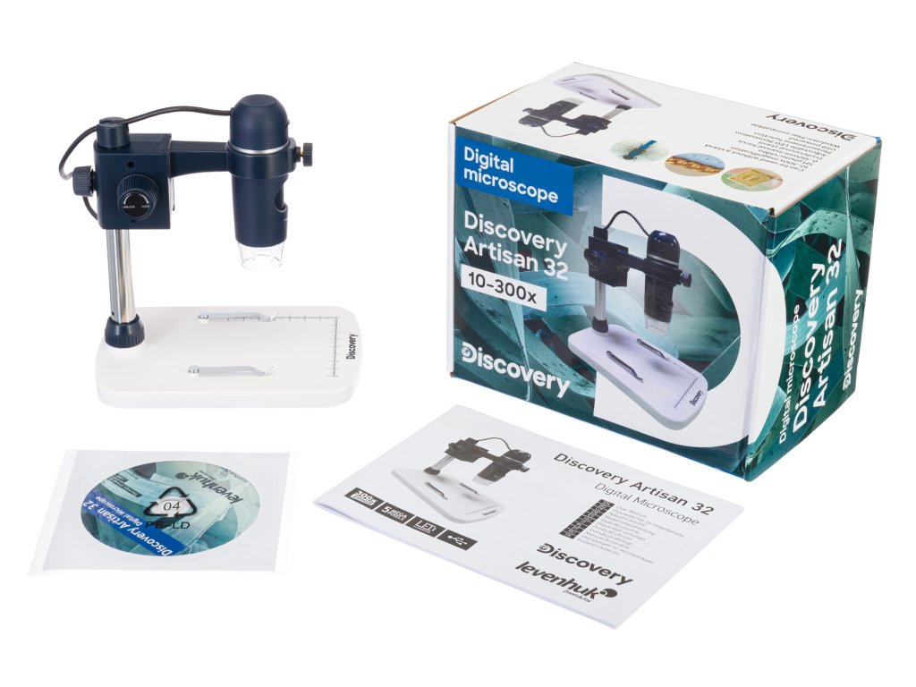 Mikroskop je namontován na stojanu, ale lze jej používat i bez něj. Na stolku mikroskopu jsou dvě kovové svorky a měřící stupnice. Tělo mikroskopu je pogumováno. Tento gumový potah je příjemný na dotek, poskytuje pohodlné uchopení a přístroj chrání před drobnými škrábanci. Levenhuk Discovery Artisan 32 je úžasný digitální mikroskop pro profesionální práci i k provozování koníčků, snadno se používá a má mnoho užitečných funkcí.