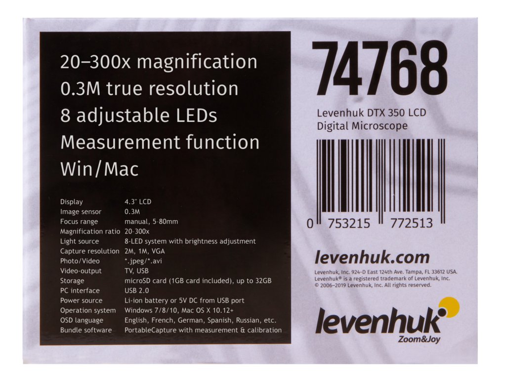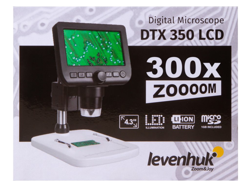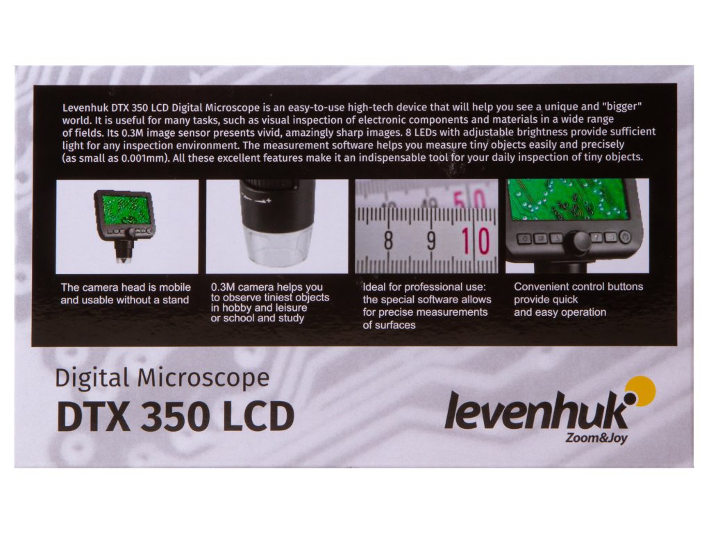 Mikroskop Levenhuk DTX 350 LCD je navržen k provádění aplikovaného výzkumu. Lze jej používat místo lupy k pozorování maloobjemových objektů (mince, semena, hmyz) nebo místo mikroskopu ke studiu neprůhledných vzorků. Levenhuk DTX 350 LCD se snadno používá a je perfektní pro studium nebo jako koníček a lze jej rovněž používat pro profesionální činnost.