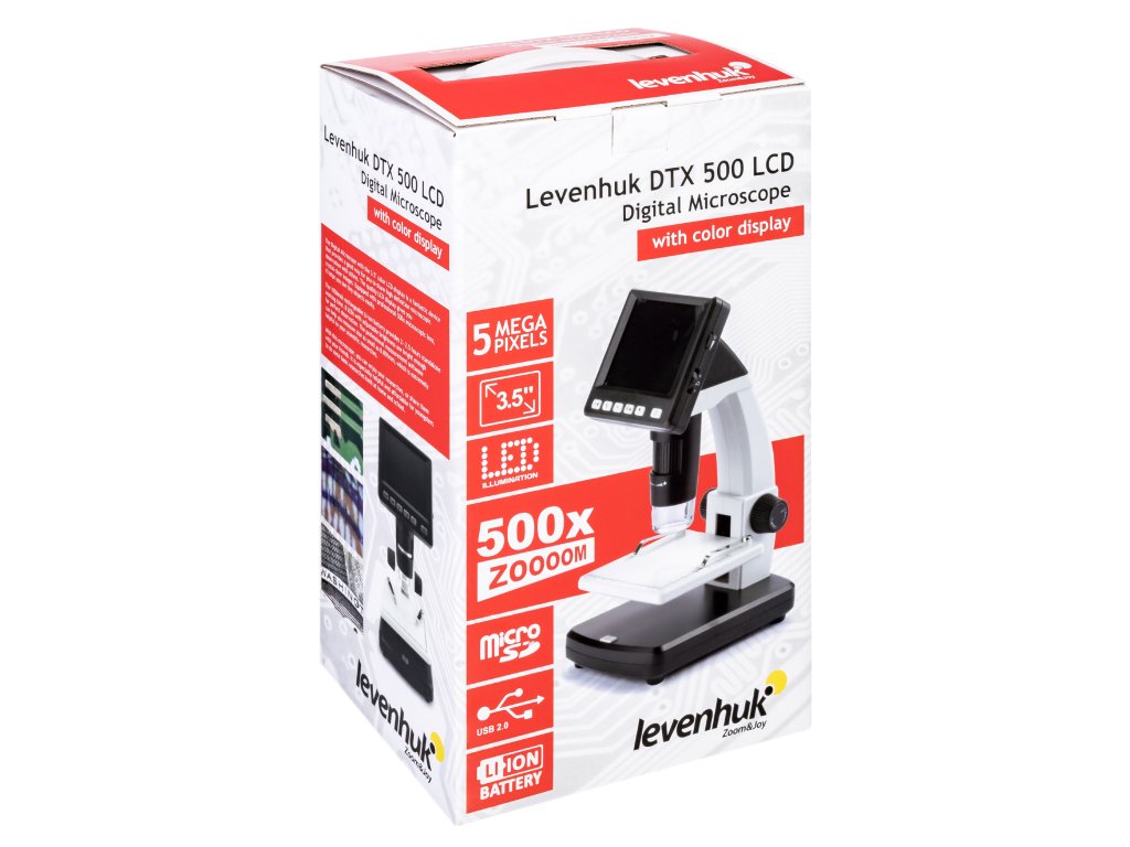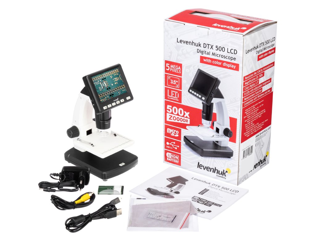 Barevný 3,5" LCD displej tohoto mikroskopu je vybaven tlačítky rychlého přístupu, která vám umožňují snadno nastavit jas, expozici a vyvážení barev. Levenhuk DTX 500 LCD můžete pomocí kabelu USB, který je součástí soupravy, snadno připojit ke svému PC a všechny soubory vytvořené během pozorování zkopírovat na pevný disk. Tento model je dále vybaven výstupem AV, který umožňuje sledovaný obraz v reálném čase přenášet na obrazovku televizoru nebo do projektoru.