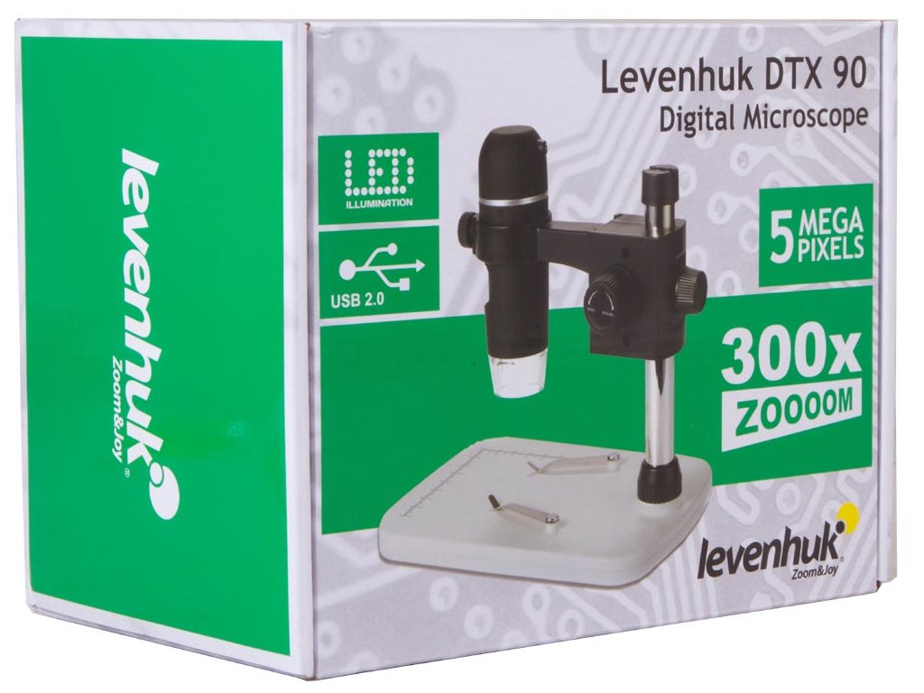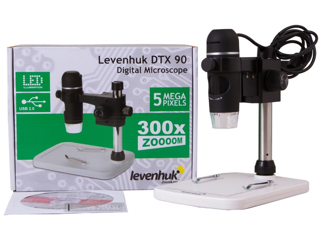 Digitální mikroskop Levenhuk DTX 90 disponuje zvětšením od 10 do 300x. Tento přístroj je vybaven fotoaparátem s rozlišením 5 Mpx. Dodává se včetně speciálního stativu, stojanu s měřicí stupnicí (8 cm podél osy x, 7 cm podél osy y) a dvěma úchyty k upevnění preparátu pod fotoaparátem.