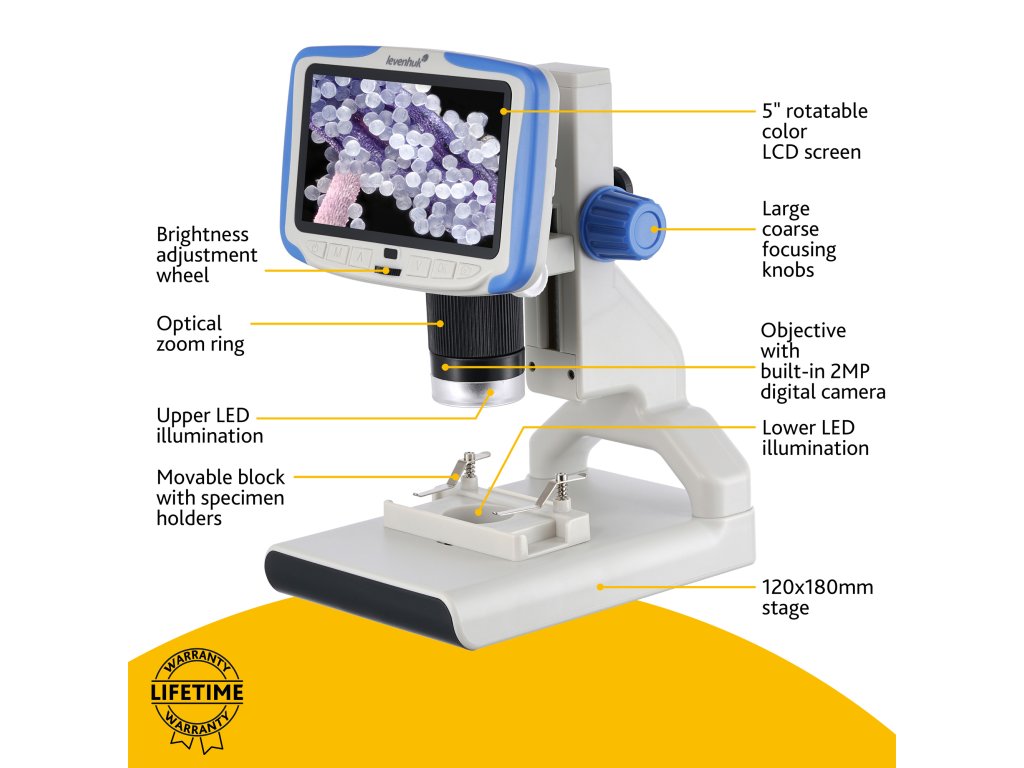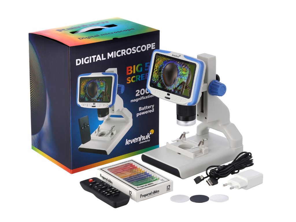 Digitální mikroskop Levenhuk Rainbow DM500 LCD je přístroj určený k pozorování objektů libovolné průhlednosti. Je vhodný k pozorování částí rostlin, hmyzu a předem připravených vzorků. Zkoumat lze kameny, mince, elektronické součásti a mechanismy. Tento mikroskop také umožňuje zachytit snímky a zaznamenávat videa. Tento proces lze ovládat pomocí bezdrátového dálkového ovládání.