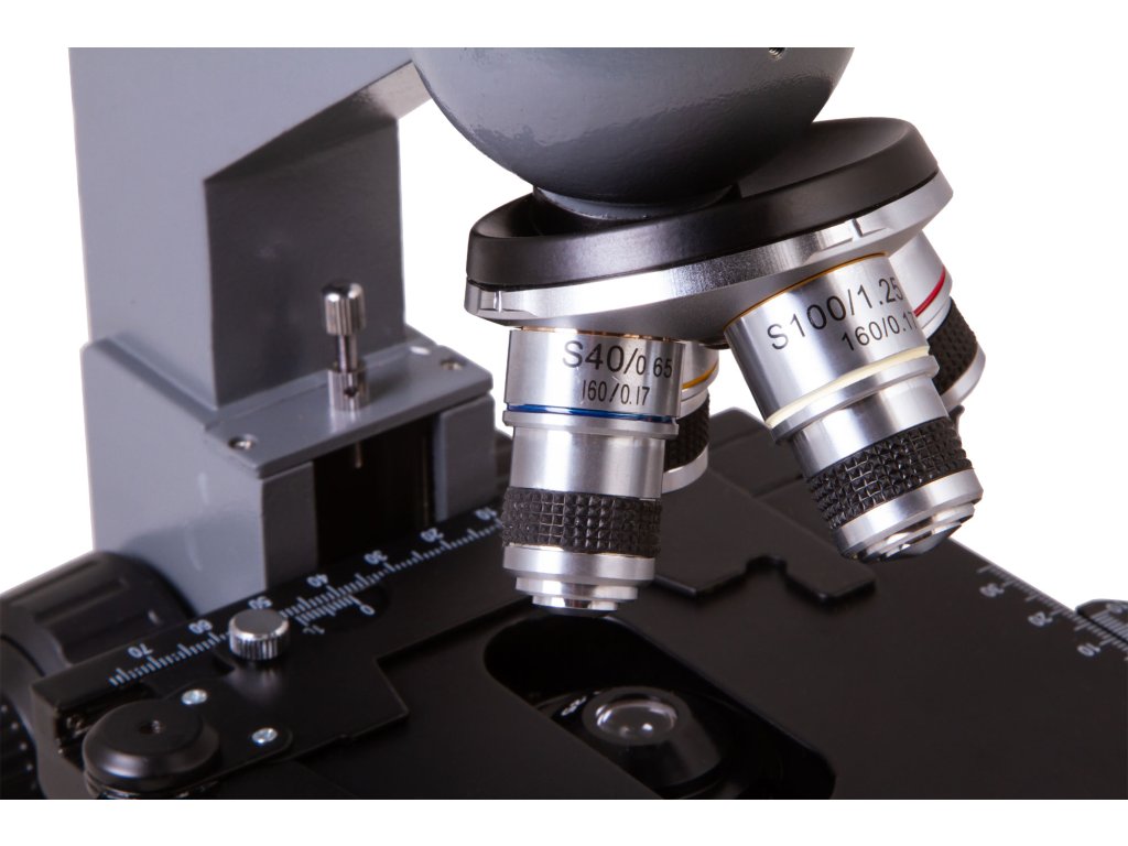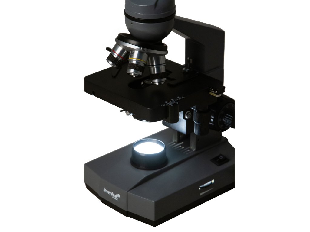 Levenhuk D320L BASE je monokulární mikroskop s otočnou hlavicí v rozsahu 360°. Pro pozorování se používá širokoúhlý okulár se zvětšením 10x a čtyři achromatické objektivy s různými hodnotami zvětšení. Rozsah zvětšení se pohybuje od 40x do 1000x. Můžete používat olejovou lázeň při maximálním zvětšení (s objektivem 100x). Součástí sady je láhev s imerzním olejem.