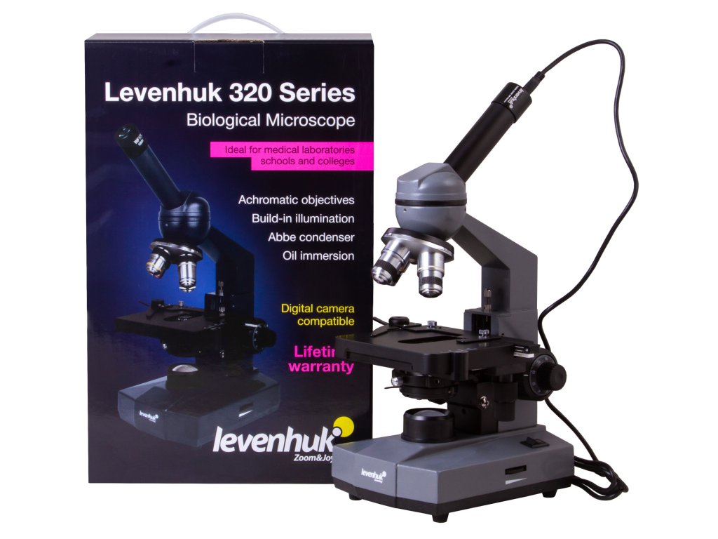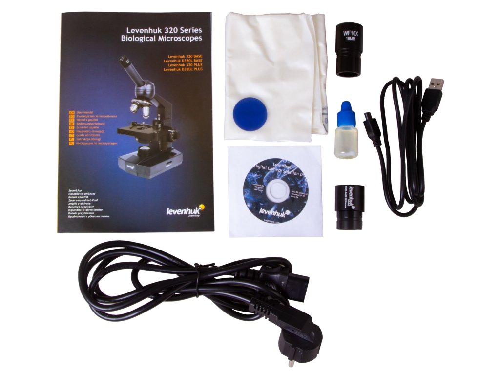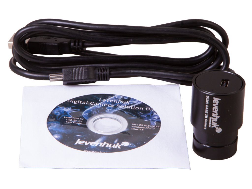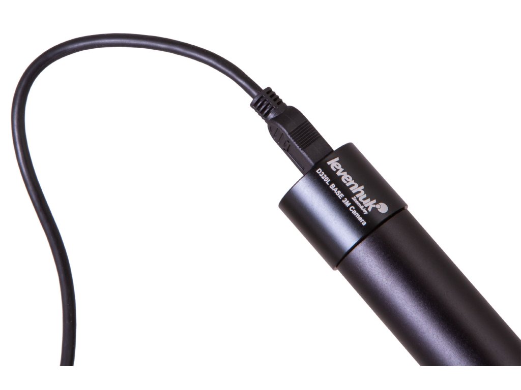 Mikroskop Levenhuk D320L BASE je kompatibilní s digitálními fotoaparáty Levenhuk (kupují se samostatně). Fotoaparáty Levenhuk se instalují místo okuláru na jeho tubus.