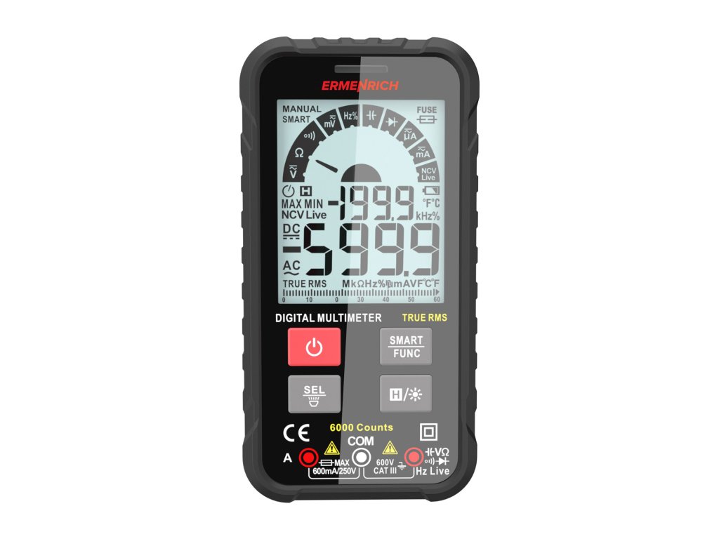 Digitální multimetr Ermenrich Zing TC19 je nezbytným nástrojem pro každodenní práci profesionálního elektrikáře. V každodenním životě pomáhá při testování elektrických spotřebičů a elektroinstalace a při hledání závad v elektrickém vybavení automobilu. Díky kompaktnímu a lehkému designu se snadno přenáší a jednoduché ovládání usnadňuje běžnou práci. Multimetr poskytuje vysokou přesnost měření, protože používá výpočty True RMS.