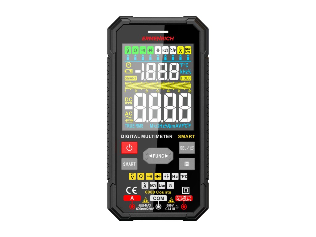 Digitální multimetr Ermenrich Zing TC27 se používá k testování elektrických zařízení a elektrických obvodů. Jeho široká funkčnost vám umožní používat jej nejen doma, ale i pro profesionální práci. Multimetr je vynikající volbou pro mechaniky, elektrikáře, opraváře a další technické pracovníky. Multimetr Ermenrich Zing TC27 je přístroj True RMS, který zaručuje vysoce přesná měření nesinusových signálů.