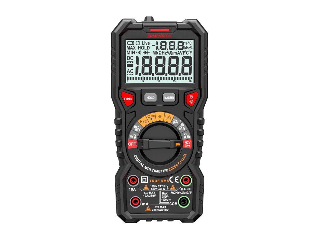 Multimetr Ermenrich Zing TC32 je kompaktní a lehký přístroj, který se vejde do kapsy. Přístroj je napájen bateriemi. Když jsou baterie vybité, přístroj vás na to upozorní. Pro úsporu energie je k dispozici funkce automatického vypnutí. K dispozici je vestavěná svítilna.