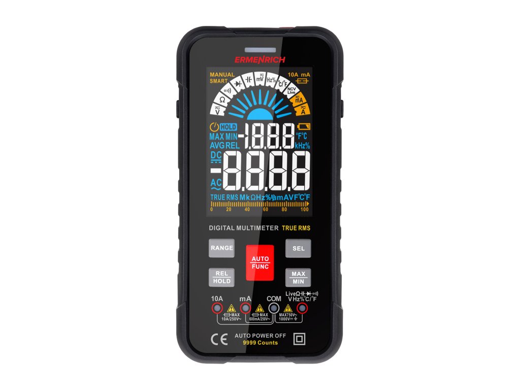 Digitální multimetr Ermenrich Zing TC35 kombinuje funkce několika elektrických měřicích přístrojů: voltmetru, ampérmetru, ohmmetru, měřiče kapacity a měřiče frekvence. Dokáže měřit pracovní cyklus a určovat teplotu. Mezní hodnotu měření lze zvolit ručně nebo automaticky. Multimetr je kompaktní a lehký přístroj, který má barevný displej s číslicemi a grafickou stupnici. Podsvícení displeje a vestavěná svítilna usnadňují práci v prostředí se slabým osvětlením.