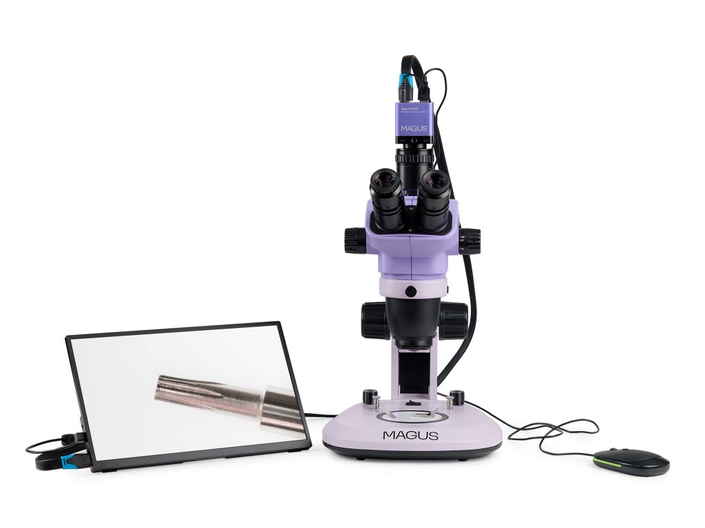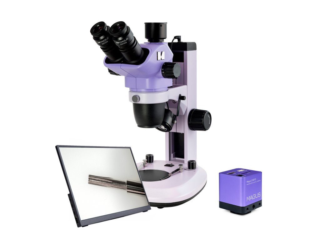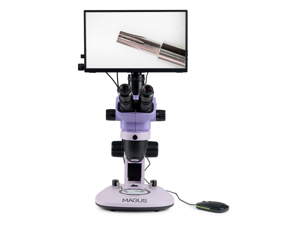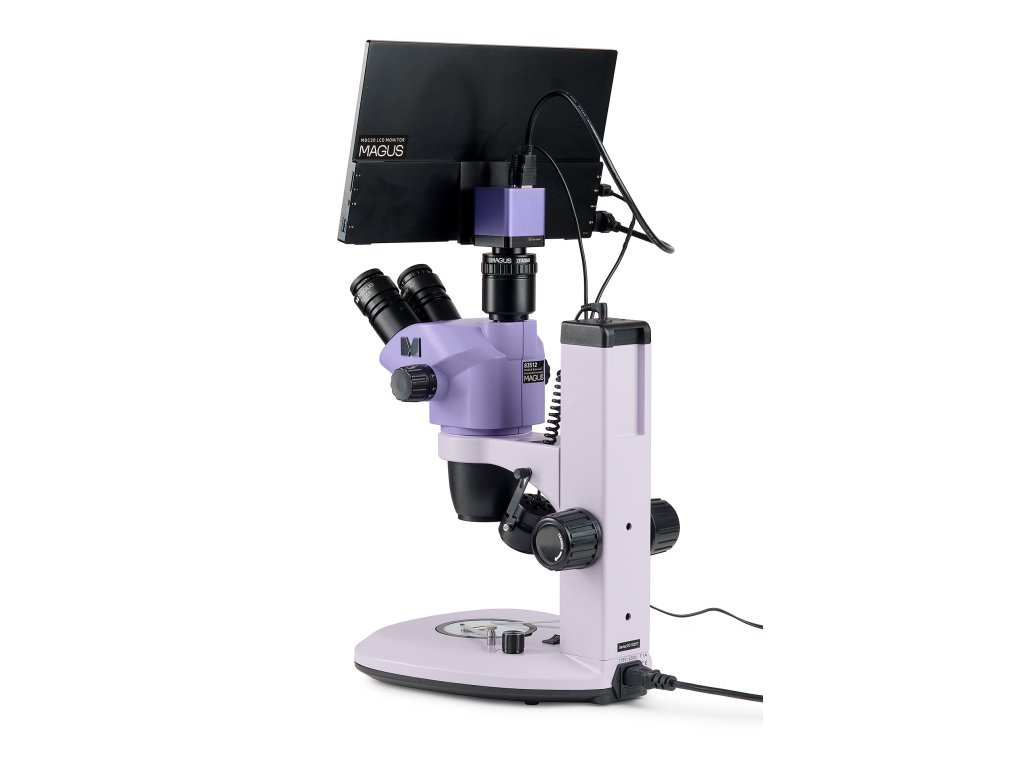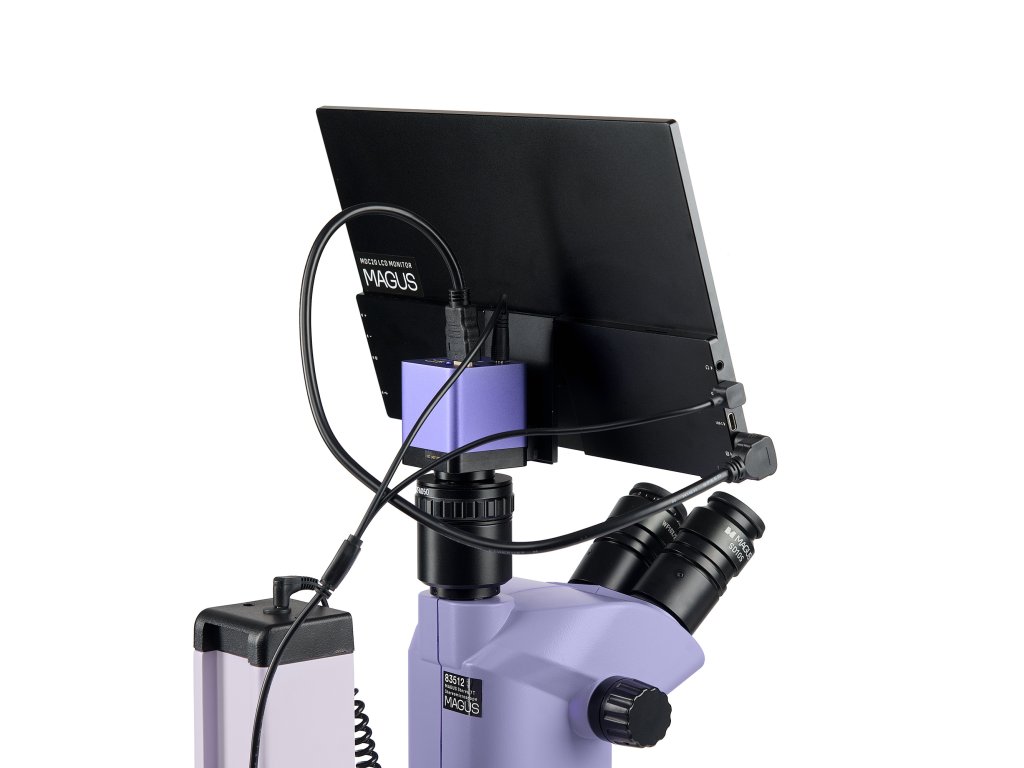 Monitor se připojuje k fotoaparátu namontovanému na mikroskopu a zobrazuje obraz v reálném čase. Je kompatibilní s fotoaparáty MAGUS HDMI pracujícími v rozlišení Full HD. Úhlopříčka displeje je 13,3 palce. Snímač IPS poskytuje jasný obraz s velkými pozorovacími úhly: pokud se na monitor díváte pod úhlem, nedochází ke zkreslení barev. Monitor je umístěn na stole a připevněn k fotoaparátu. Trinokulární mikroskop s monitorem je vhodný pro ty, kteří se raději dívají na vzorek dopředu než dolů. Tento způsob pozorování je nejergonomičtější, protože snižuje zátěž zad a krku. Tento mikroskop s monitorem je vhodný i pro pedagogy ve třídách.