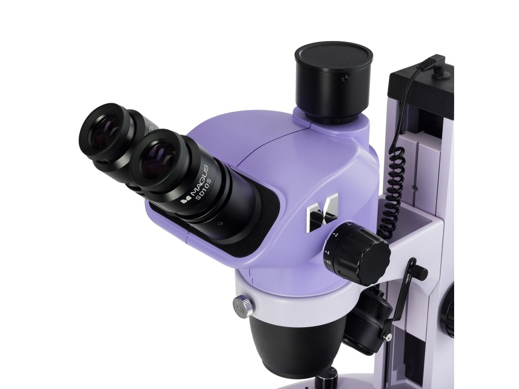 Trinokulární hlava je otočná o 360° a lze ji uzamknout v libovolné poloze. Dráha světla se nemění. Poměr rozdělení je pevně stanoven: 80 % do okuláru a 20 % do trinokulárního tubusu. Uživatel sleduje obraz v okulárech a současně na obrazovce. Základní konfigurace obsahuje okuláry 10x/22 mm s dioptrickou korekcí a dlouhým očním reliéfem pro práci s brýlemi.