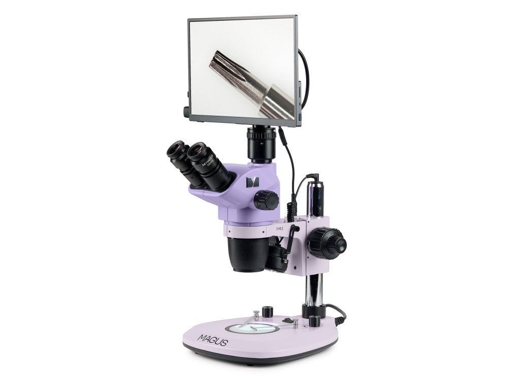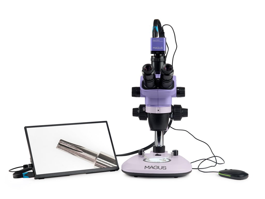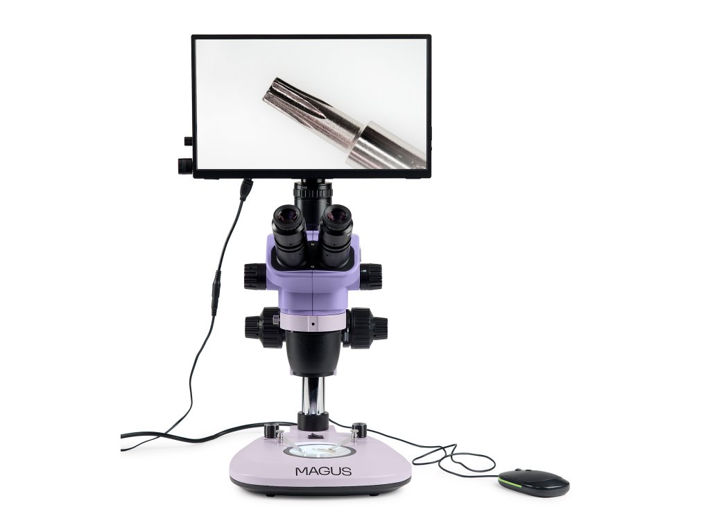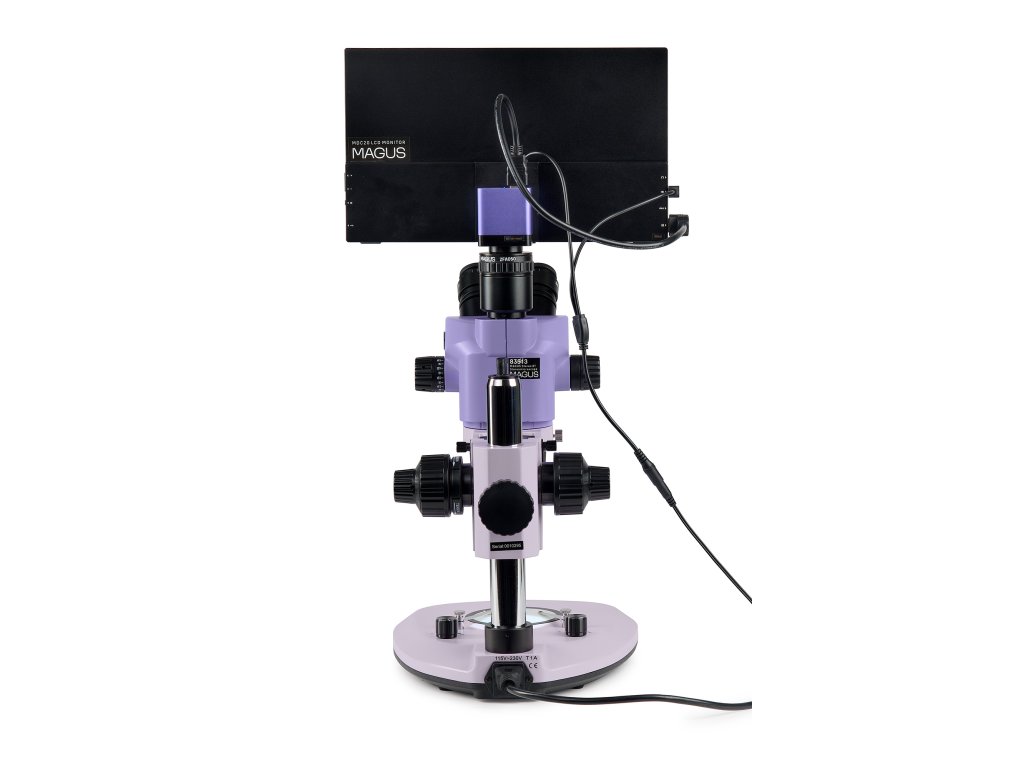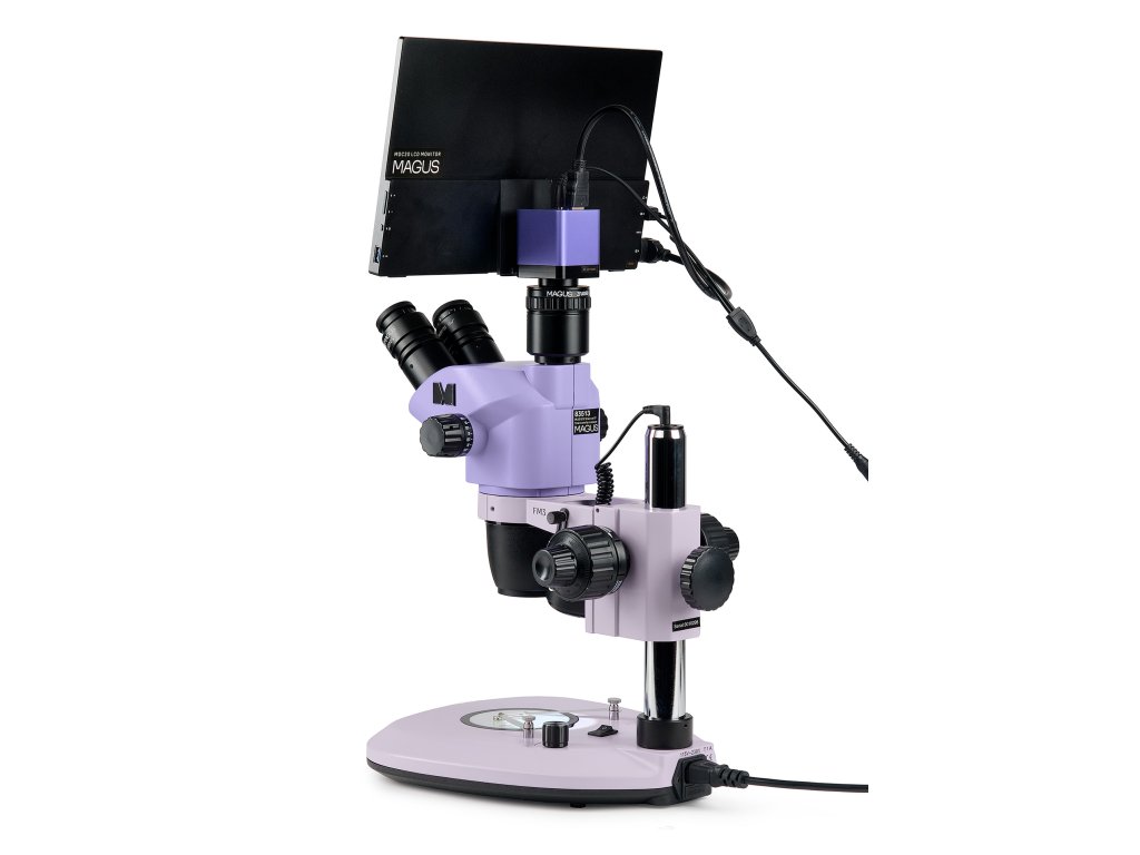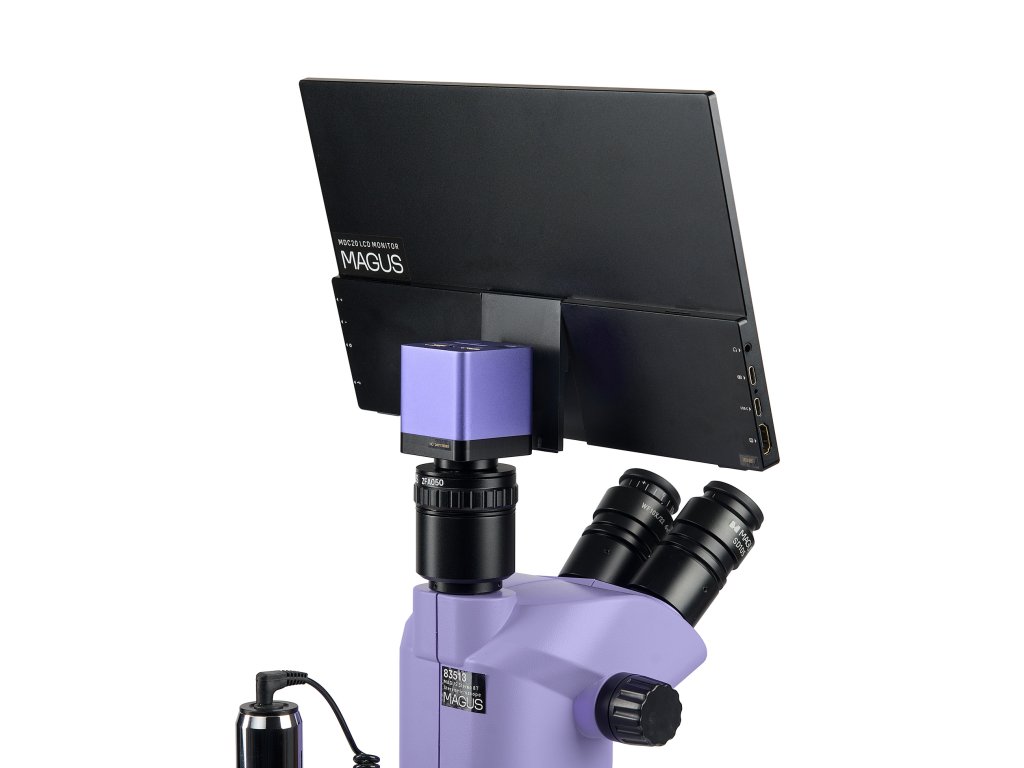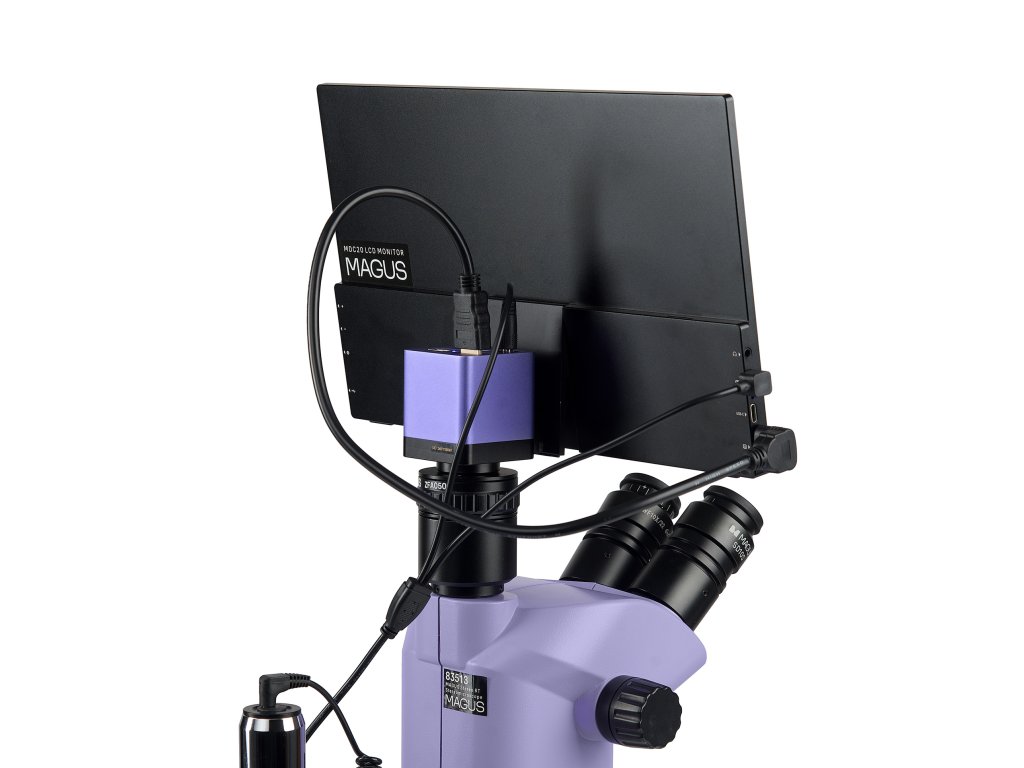 Monitor se připojuje k fotoaparátu namontovanému na mikroskopu a zobrazuje obraz v reálném čase. Je kompatibilní s fotoaparáty MAGUS HDMI pracujícími v rozlišení Full HD. Úhlopříčka displeje je 13,3 palce. Snímač IPS poskytuje jasný obraz s velkými pozorovacími úhly: pokud se na monitor díváte pod úhlem, nedochází ke zkreslení barev. Monitor je umístěn na stole nebo připevněn k fotoaparátu. Trinokulární mikroskop s monitorem je vhodný pro ty, kteří se raději dívají na vzorek dopředu než dolů. Tento způsob pozorování je nejergonomičtější, protože snižuje zátěž zad a krku. Tento mikroskop s monitorem je vhodný i pro pedagogy vyučující studenty.