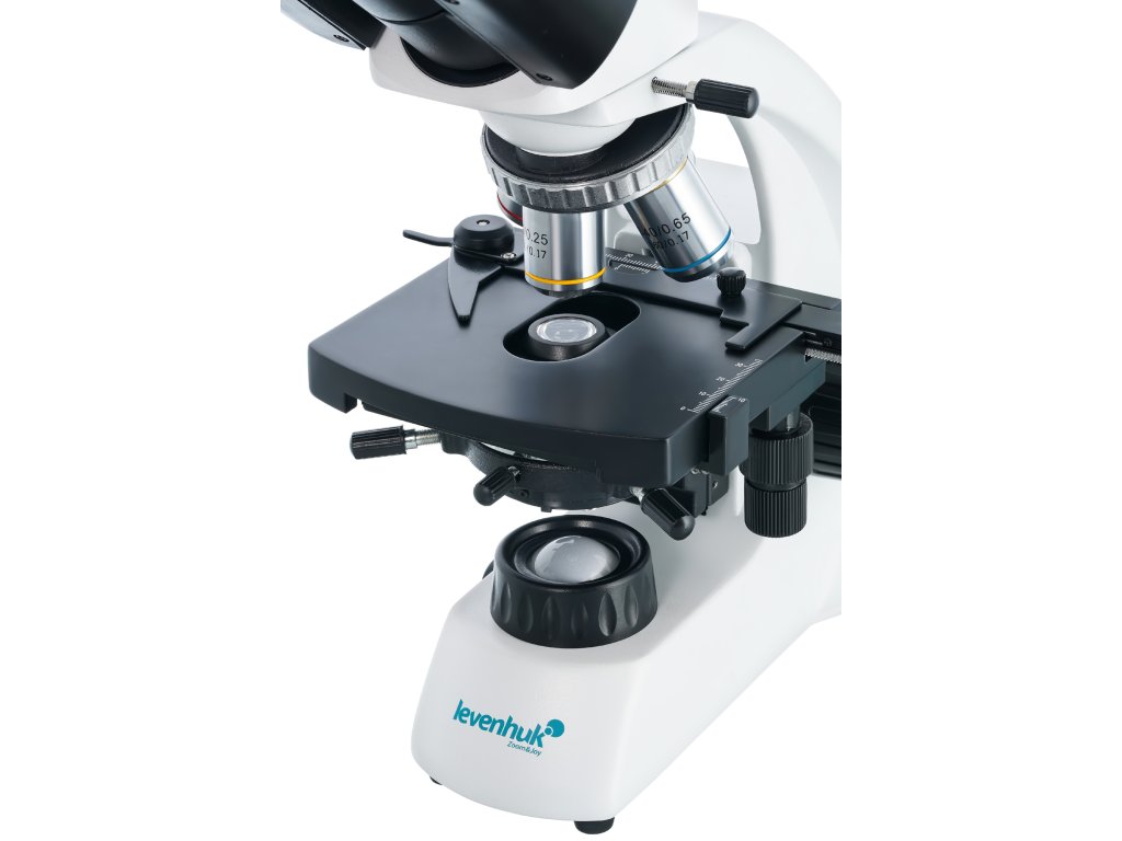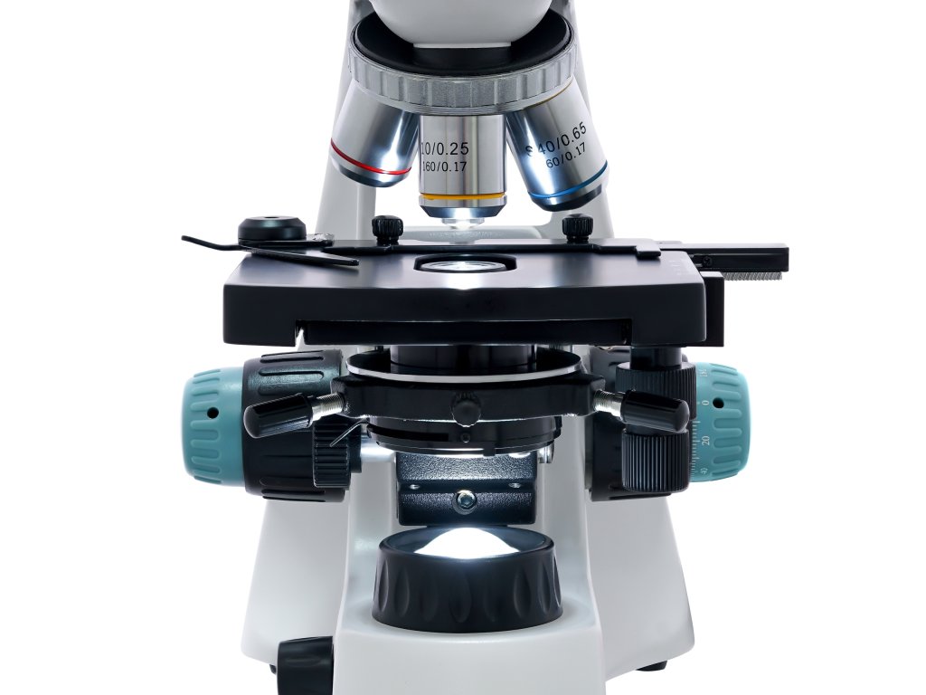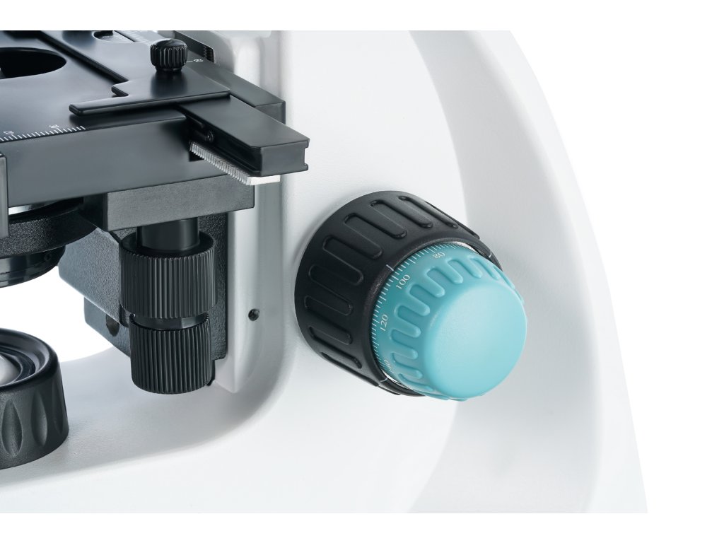 K dispozici je mechanické měřítko pro upevnění mikroskopických sklíček. Ve spodní části je umístěno jasné LED osvětlení a čočka kolektoru. Jas osvětlení je nastavitelný. Systém osvětlení zahrnuje také Abbeho kondenzor s irisovou clonou, který umožňuje nastavení intenzity světla. S tímto mikroskopem můžete použít světelné filtry.