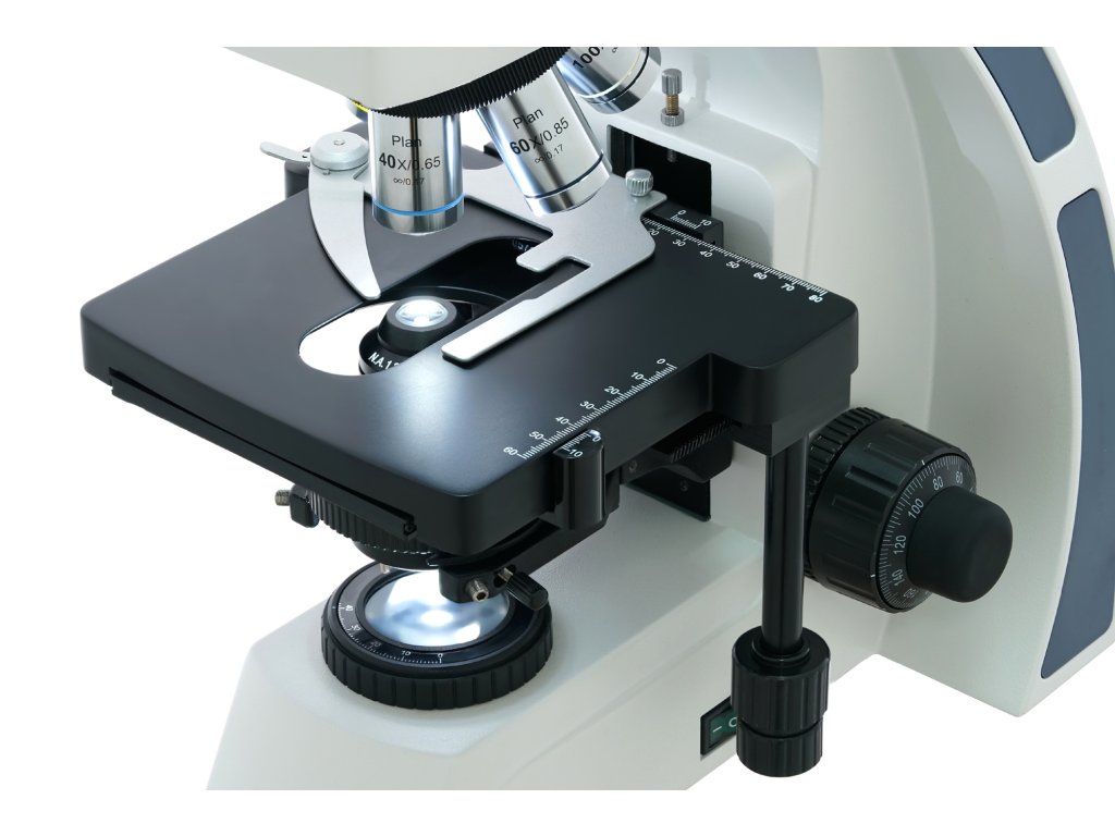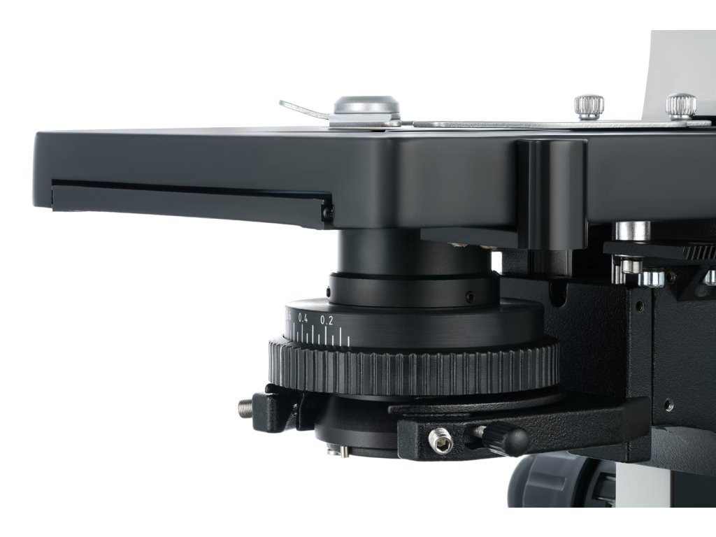 Dvojstupňový stolek je vybaven mechanickou stupnicí. Systém osvětlení je umístěn ve spodní části; obsahuje LED diodu a Abbe kondenzor s irisovou clonou. Intenzita jasu světla lze regulovat.