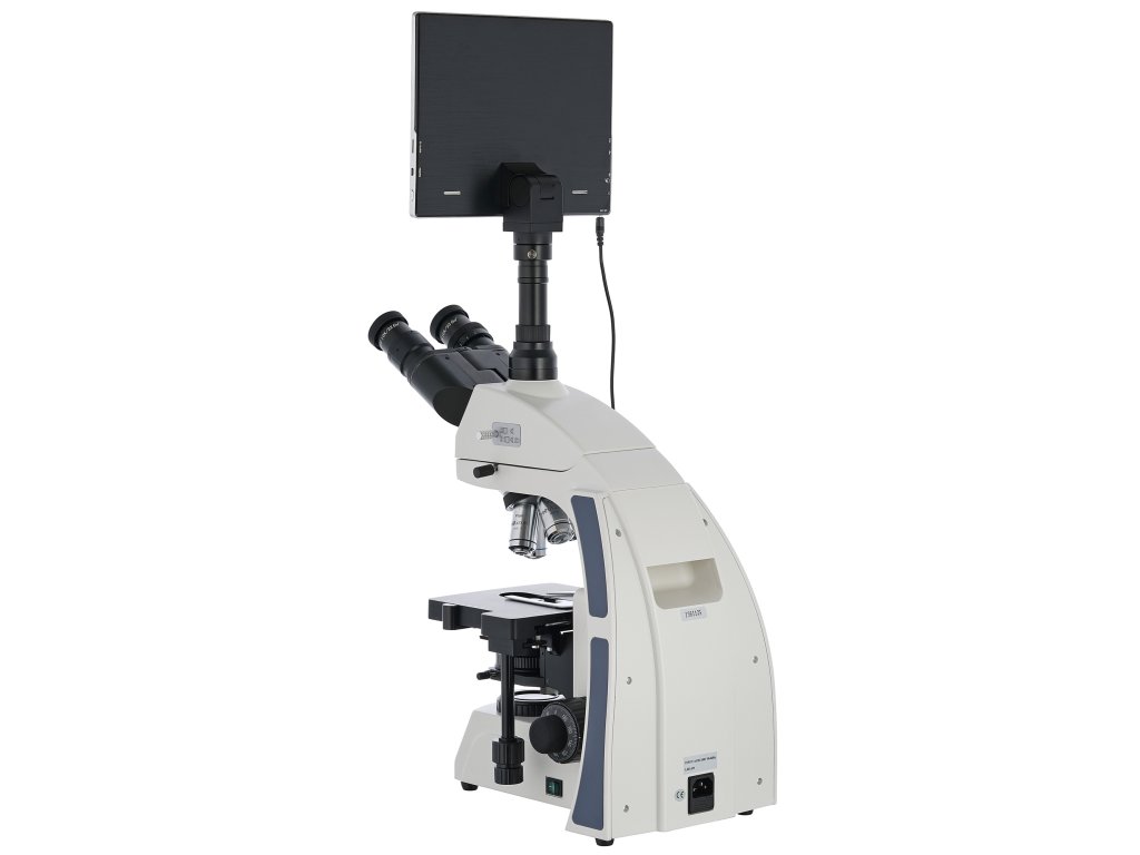 Trinokulární hlavice může být otočena o 360°, mikroskop je tedy vhodný pro skupinová studia. Binokulární vizuální část se naklání o 30°, zatímco okulárová trubice pro digitální fotoaparát je vertikální. Sada obsahuje LCD fotoaparát 5 MP. Nemusíte provádět připojování k počítači ani instalovat další software. Fotoaparát poskytuje obraz na vestavěné obrazovce; tento fotoaparát může být propojen s externí obrazovkou nebo televizorem; může být připojen k dalšímu zařízení (sluchátka, klávesnice, počítačová myš atd.). Jsou podporovány paměťové karty a další zařízení pro ukládání dat. Fotoaparát umožňuje pořizovat fotografie a videa s vysokým rozlišením.