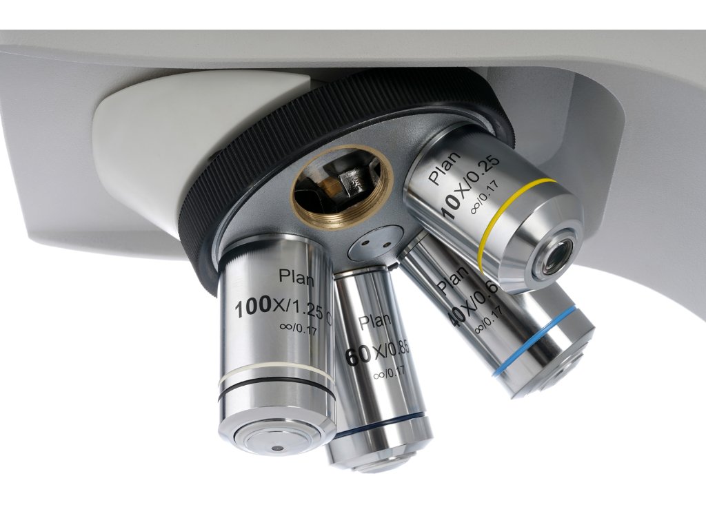 - Rovinné achromatické objektivy s korekcí na nekonečno: 4x, 10x, 40xs, 60xs, 100xs (olej) s protiplísňovým povlakem