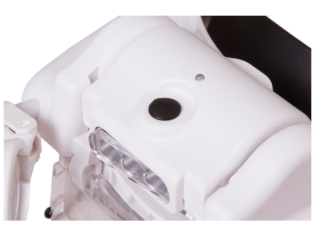 Vedle funkční optiky se také sluší zmínit možnost přisvícení. Přisvícení se nachází uprostřed lupy, skládá se ze tří LED světel a je napájeno ze tří dobíjecích baterií. Dobíjení baterií: vyjměte modul přisvícení z těla lupy a dodaný kabel USB-microUSB připojte k USB portu počítače nebo adaptéru. Jas přisvícení lze upravit pomocí tlačítka ON (ZAP).