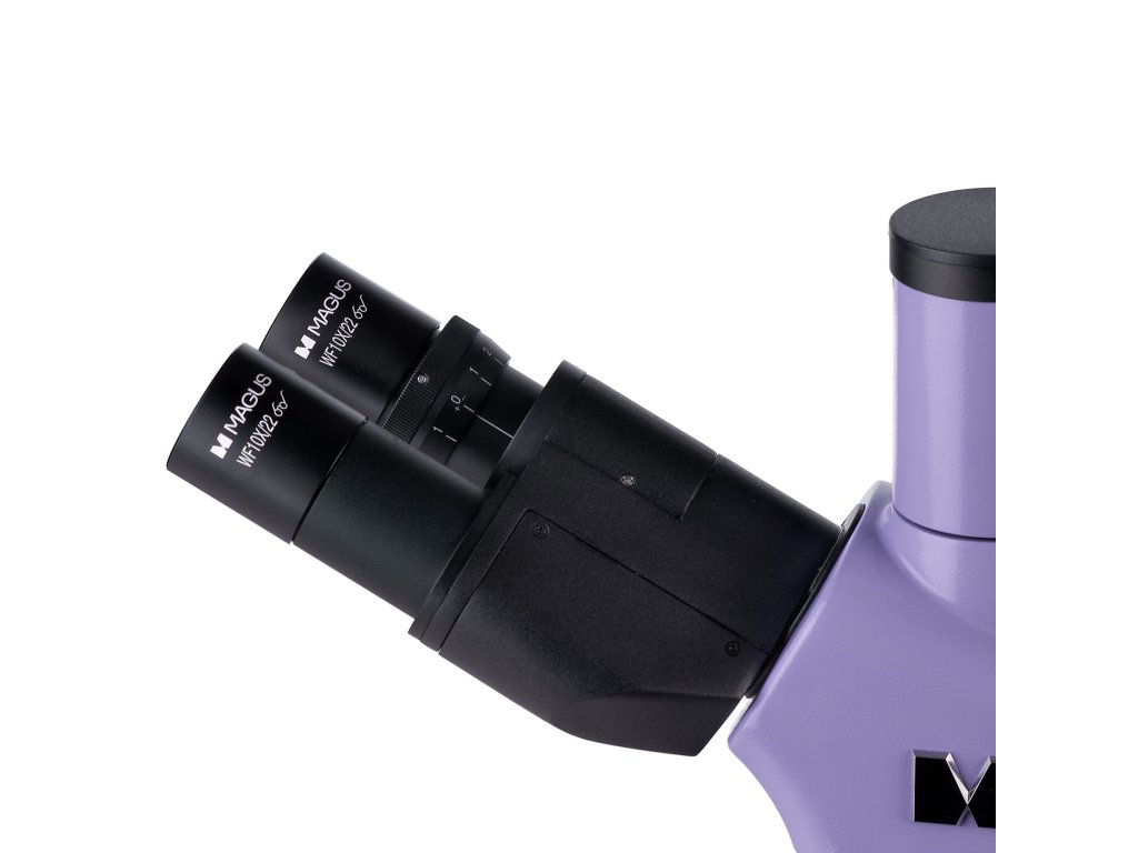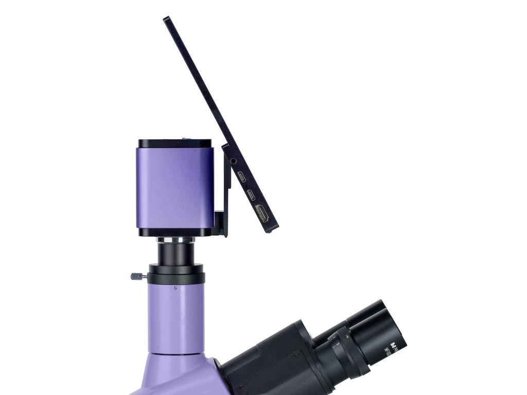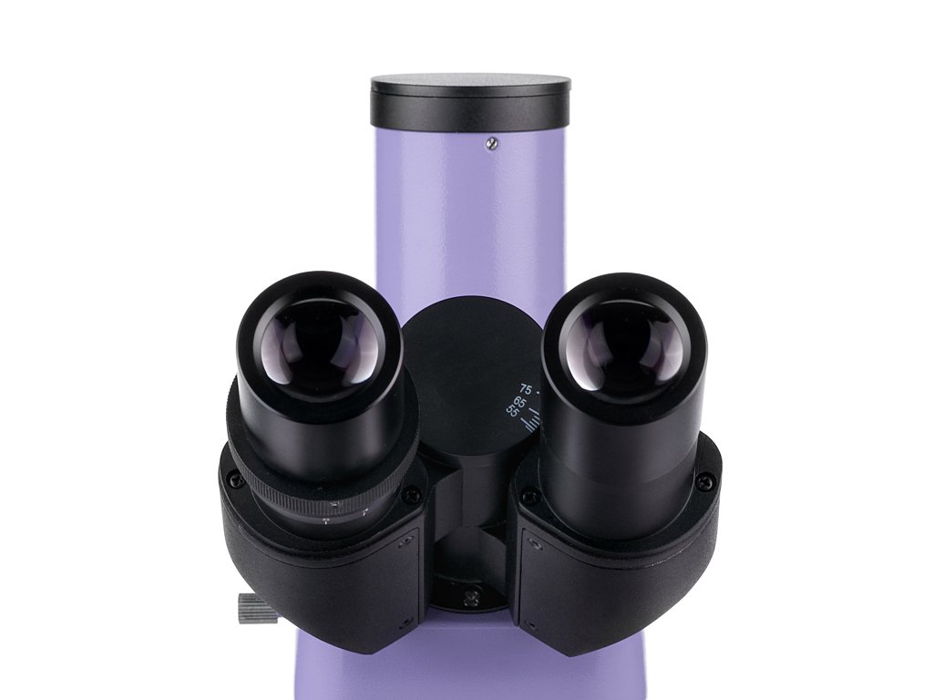 Toto je trinokulární mikroskop: Binokulární hlava je nakloněná o 30° a digitální fotoaparát (není součástí dodávky) je nainstalován do trinokulárního tubusu. Protože okulárovými tubusy lze otáčet o 360°, je snadné je nastavit, aby odpovídaly výšce uživatele.